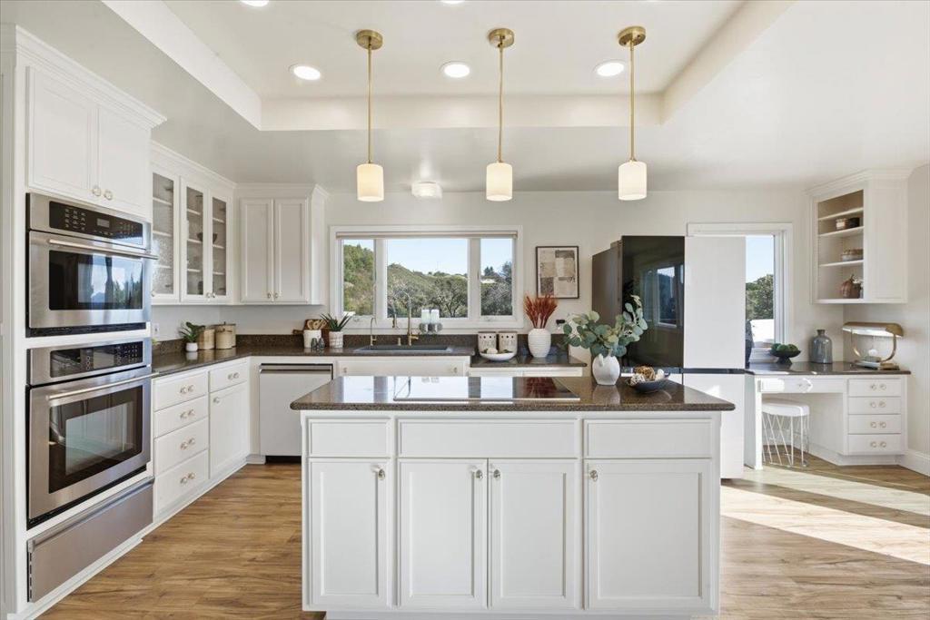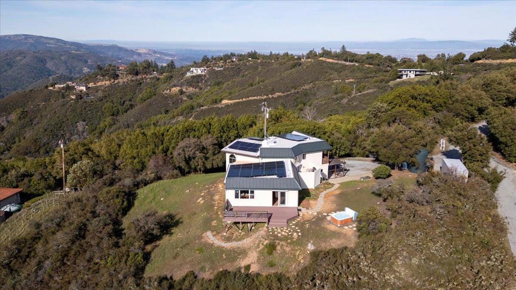 Experience an exceptional blend of stunning views & prime location in this Saratoga residence, ideally situated near downtown Saratoga's restaurants, shopping, coffee, wine tasting, & more. Near top-ranked Saratoga schools! On appx 2.3 acres, this 4 bedroom home offers ~2,688 sq ft of thoughtfully designed living space with breathtaking panoramic views stretching from Monterey Bay to the San Francisco Bay. The gourmet kitchen features a center island, shaker cabinetry, granite counters, & modern stainless appliances, seamlessly connected to the dining area & overlooking a massive deck & spectacular vistas -ideal for everyday living & entertaining. The expansive living room showcases vaulted ceilings, a fireplace, and dramatic picture windows that fill the home with natural light. The spacious primary retreat includes a walk-out balcony, en-suite bathroom with walk-in closet, creating a peaceful sanctuary with unparalleled outlooks. Enjoy movie nights in the separate family room complete with a projector screen! Smart, energy-efficient features include owned solar w/ 2 Tesla batteries, backup generator, 2 EV charging stations, newer roof, whole-home water filtration & ozone system, & high speed fiber internet. Relax in the bubbling hot tub surrounded by tranquil surroundings.