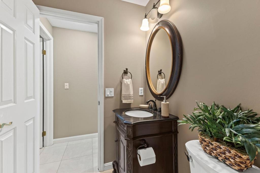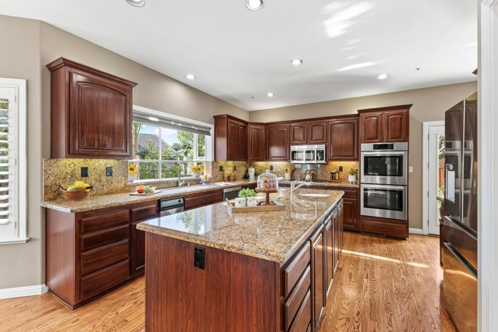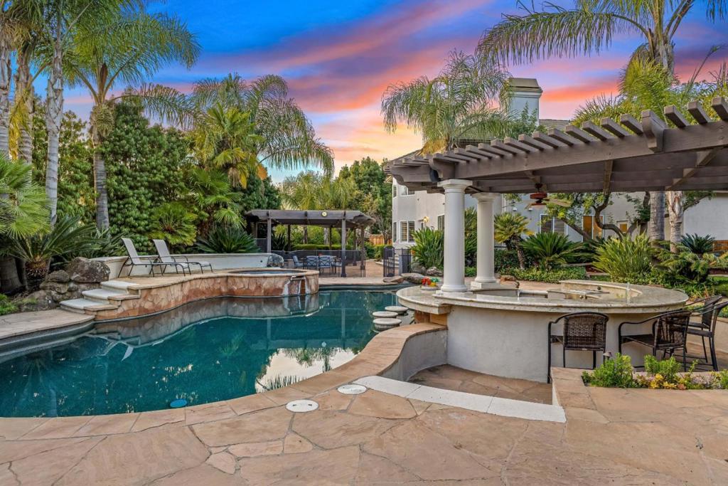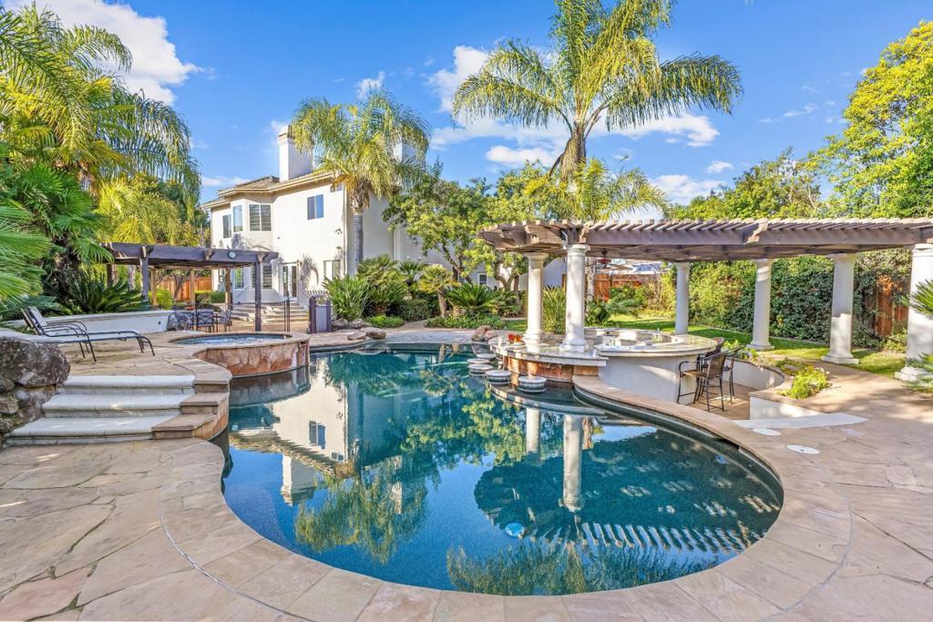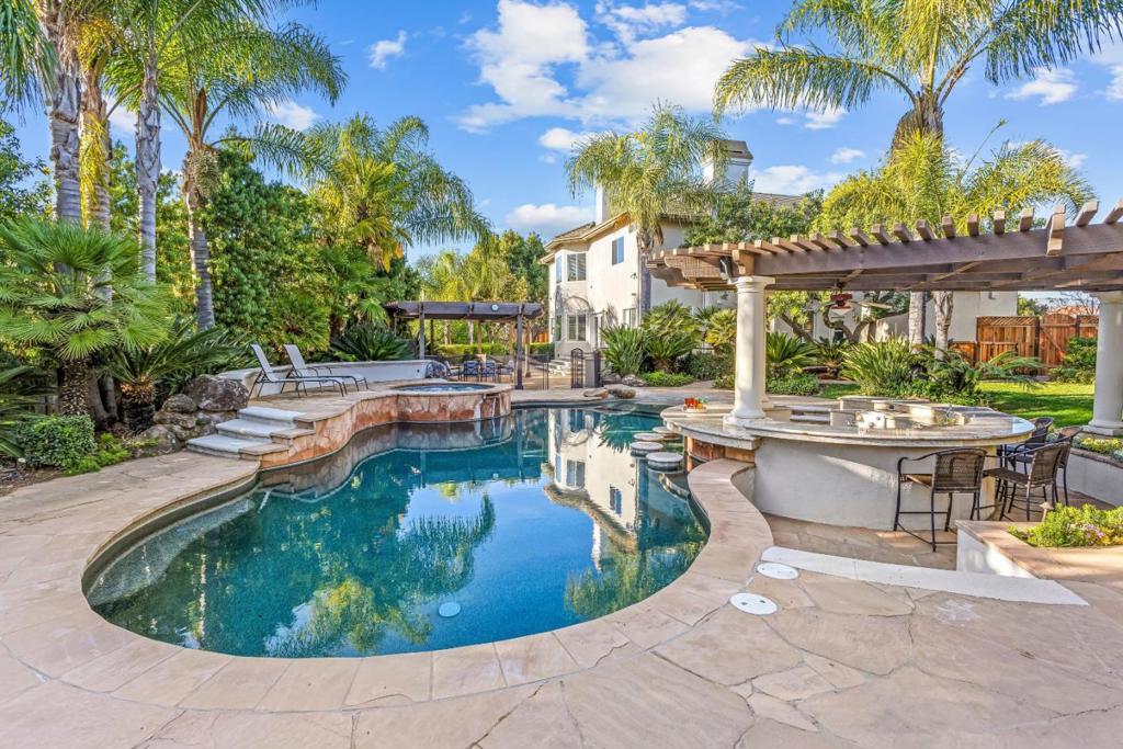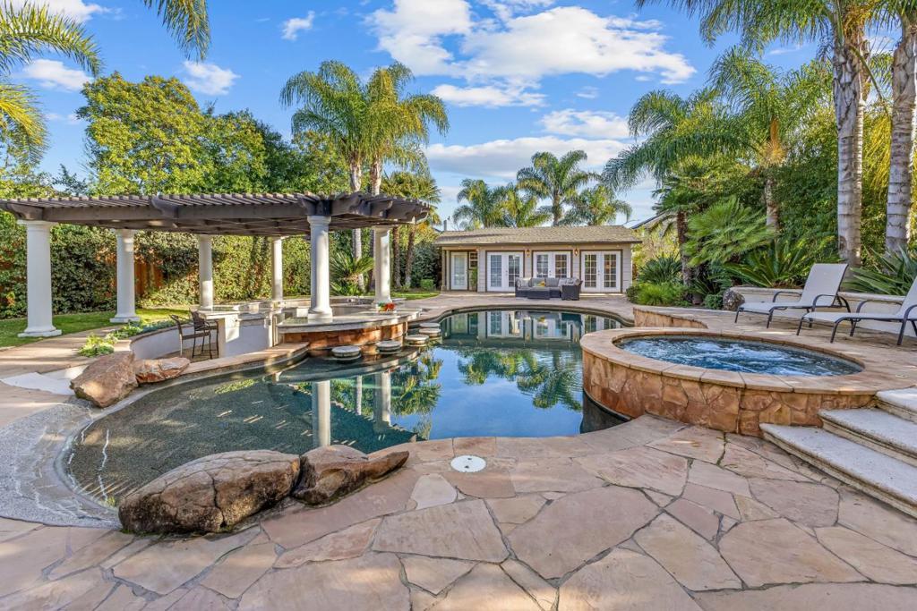 Step into this stunning custom home, where the heart of the residence features a spacious kitchen and great room accented by dramatic built-in cabinets, gleaming hardwood floors, and elegant plantation shutters throughout much of the downstairs. The open-concept layout ensures a perfect flow for entertaining, whether youre hosting casual gatherings or formal parties. Enjoy the warm glow from the kitchen garden window, the ease of a convenient wet bar, and the warmth of a gas fireplace in the great rooml Ascend the formal circular staircase to an open landing and second level illuminated by skylights. The expansive primary ensuite is a luxurious retreat, boasting a brand-new bathroom and a cozy fireplace for a spa-like experience. Step outside to a backyard that feels like a tropical paradise, complete with an in-ground pool, soothing spa, swim-up bar, beautiful stone walkways, an outdoor BBQ area, lush mature vegetation, and a relaxing pergola. Additionally, the property features an impressive ADU of approximately 700 square feet, offering a modern kitchen with granite counters, a full bath, and 3 French doors that open directly to the pool areaideal for guests or extended family. Do not let this one get away!