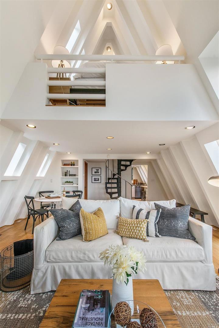 California-Modern Redux! Quintessential hip and luxurious pied-a-terre with bird nest views of Whaler's Cove in Old Town Sausalito. Published in award-winning style and design magazines, the home's dramatic details include soaring vaulted open-beam ceilings, light filled rooms, architectural walls of glass, and black steel & wood details, elegantly blending California rustic with a modern design. The living room's stunning centerpiece is a handsome floor-to-ceiling black steel fireplace. The efficient kitchen boasts top-notch stainless-steel appliances as well as solarium windows. Upstairs, two cozy bedrooms, as well as two full bathrooms, one with sauna and deep soaking tub, are set among the treetops. The property features a private rear deck and fenced hillside gardens, with multiple outdoor seating areas for lounging and relaxing. There is off-street parking and a oversized one-car garage below the home. Minutes from great dining, shopping, ferry service, and the City.