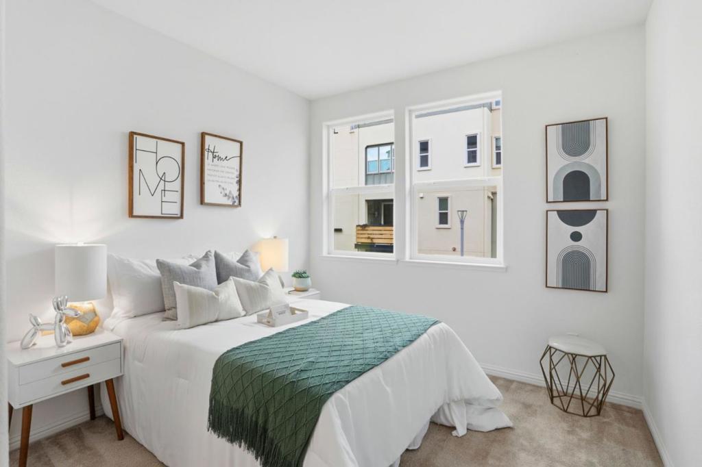 Immaculate and contemporary townhome in the central location of the desirable Onyx community. Bright and cheerful home with abundant large picture windows bringing soothing natural light. Open and functional floor plan decorated in designer's choice colors. Classy and quality engineering wood floor through the living area. Sizable kitchen with ample white Shaker cabinets, expansive quartz counters and stainless steel appliances. Large central island with a convenient breakfast bar. Modern mid-century chandelier adorns the living area with elegance. Spacious master bedroom with walk-in closet and ensuite bath with double sink vanity and large shower place. Intimate deck from the master, seamlessly blending indoor and outdoor living with an open view. Each bedroom features a walk-in closet. Convenient and separated indoor laundry. Special features in this community include BBQ/picnic area and dog friendly park. Adjacent to the new city park Newbury Park with the variety of outdoor activities. Convenient location with short commute to downtown SJ, Japantown and shoppings including Costco, Ranch 99 & H-mart. Easy access to Bart, VTA and freeways 101/680. Walking distance to Google & Meta shuttle stops.