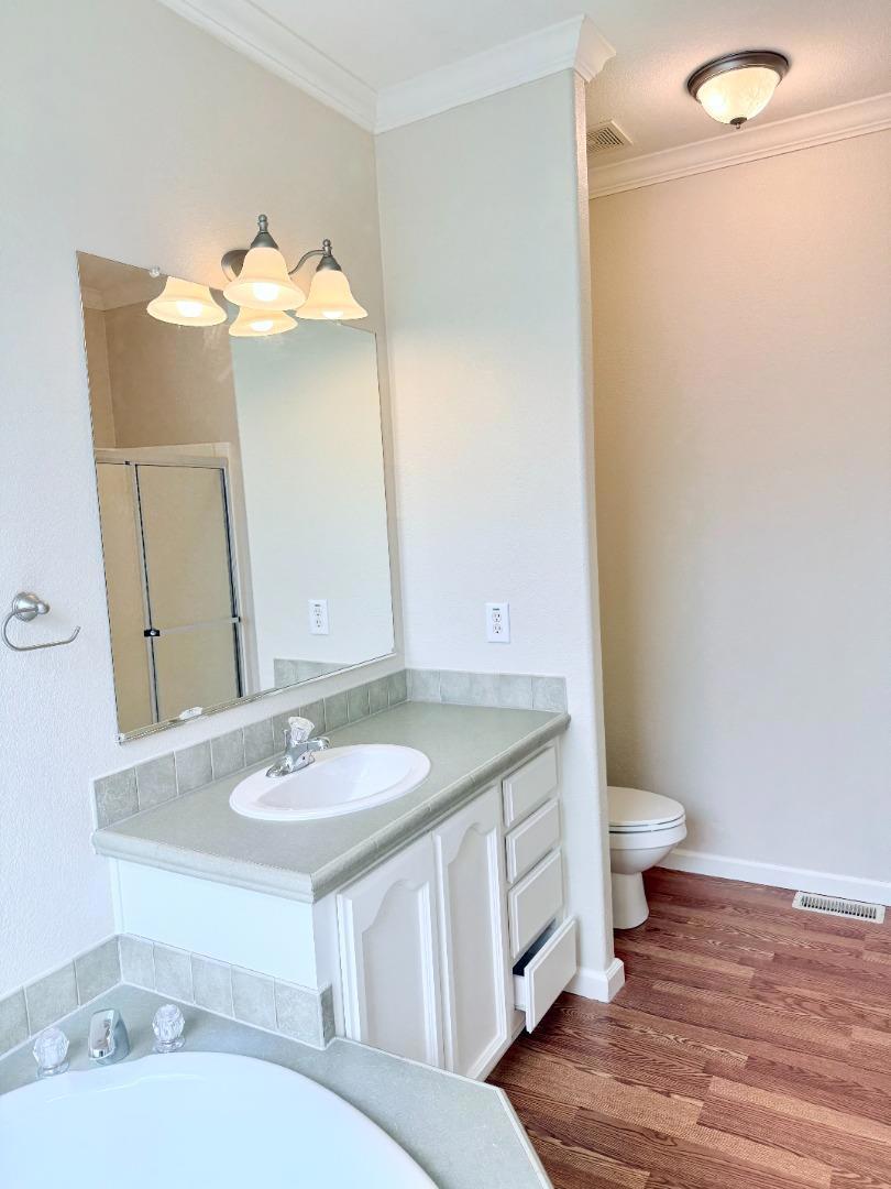 Beautifully updated 3 bedroom, 2 bath mobile home in Sunset Estates, a sought after 55+ community in Mountain View. Step into a light-filled, open-concept living and dining space with large windows, tasteful finishes, and durable hard-surface flooring throughout ideal for easy everyday living. The freshly painted kitchen offers generous white cabinetry, a gas range, ample prep space, and a functional layout that keeps everything within reach, perfect for weeknight cooking or hosting friends. Retreat to the spacious primary suite featuring a walk-in closet, soaking tub, separate shower, and dual-sink vanity for comfort and convenience. Enjoy the added practicality of an indoor laundry room with extra cabinetry, plus a convenient side entry door with access to the ADA platform lift. Outside, you'll love the welcoming front porch, attractive curb appeal, and low-maintenance landscaping. This home makes it easy to relax, garden, and enjoy. A great path to predictable long-term housing, ideal for those done renting or downsizing from a larger home. Near commute routes and local conveniences. Clubhouse, pool, billiards, and activities. Park approval required.