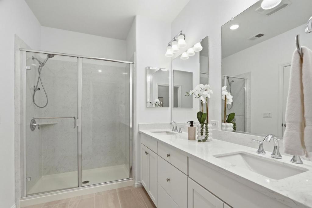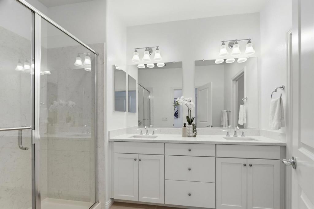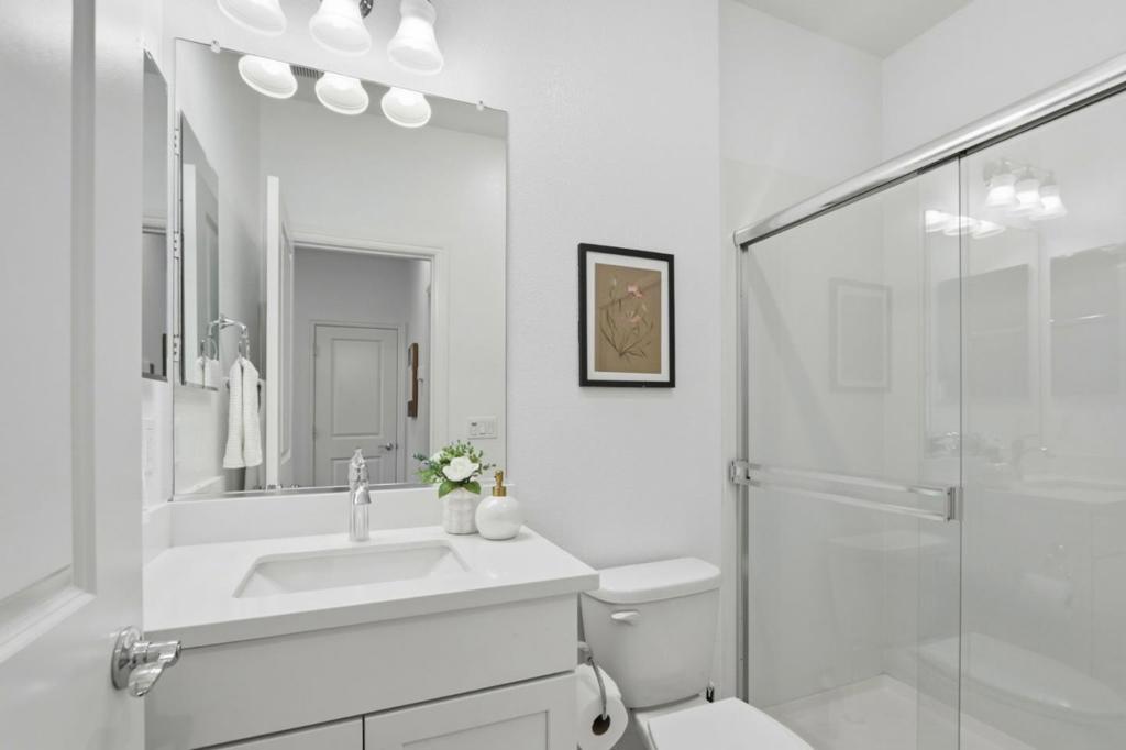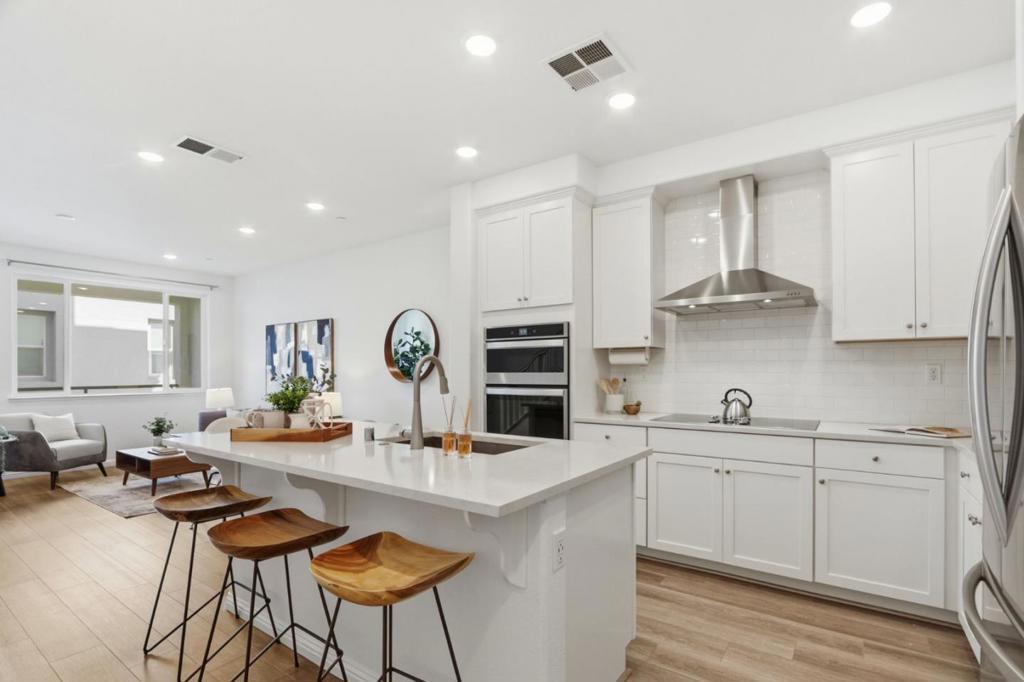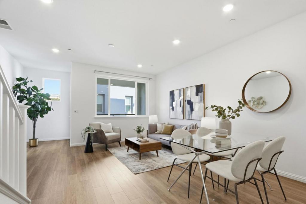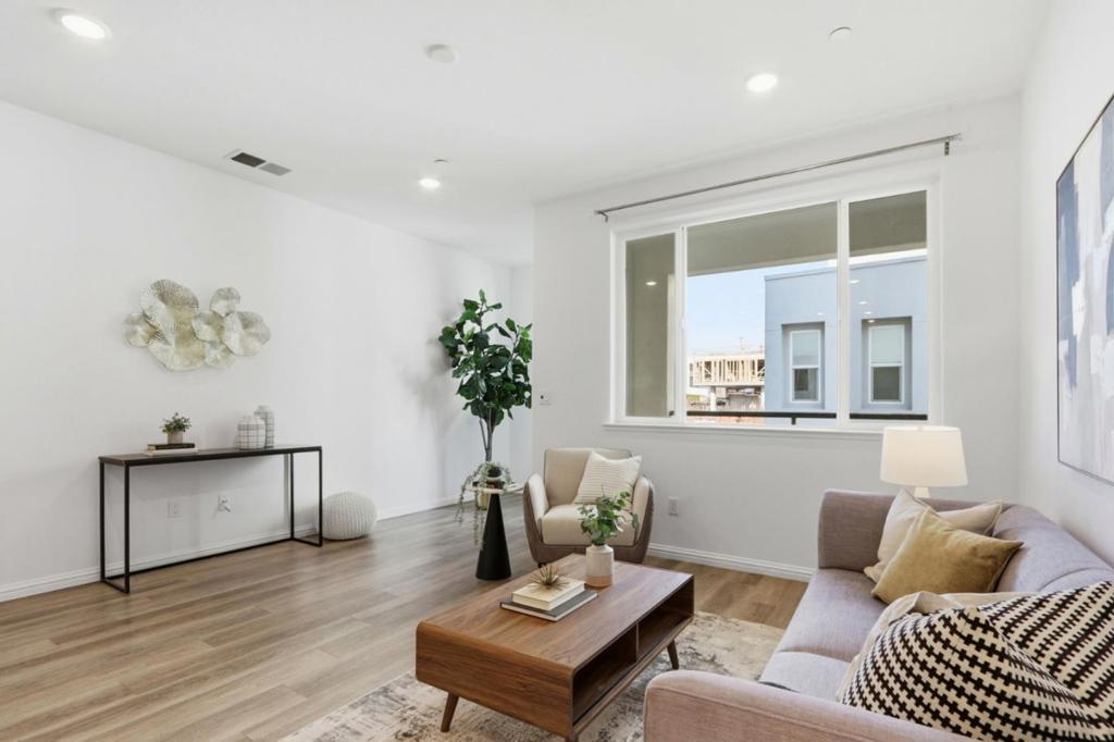 Solar-powered townhome built in 2019 by Pulte (Haven 1L model) in the heart of Silicon Valley. Desirable location with a rare front yard and private balcony overlooking a park, offering open views and privacy. Fresh interior paint and new carpet throughout. Main living level features an open-concept floor plan with a modern kitchen including white cabinetry, quartz countertops, center island with sink, stainless steel appliances, and ample storage. Kitchen opens to dining area and spacious living room. One bedroom and one full bathroom on the main level. Upper level includes two en-suite bedrooms. Primary suite offers two walk-in closets and a bathroom with dual vanities, quartz countertops, and stall shower. Secondary suite features large windows and a full bathroom with shower-over-tub. In-unit washer and dryer located on the upper level. Attached two-car garage with additional storage. Conveniently located near shopping, dining, Berryessa BART, major tech campuses, and with easy access to Hwy 101 and Hwy 680.