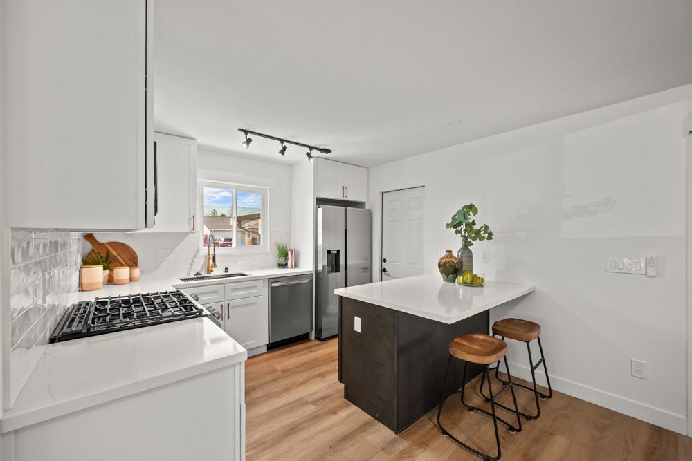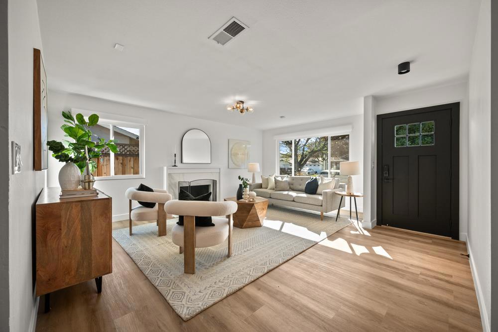 Welcome to this exquisitely remodeled modern residence in one of West San Jose's most desirable neighborhoods. Designed with both style and functionality in mind, this immaculate 3-bedroom, 2-bath home showcases contemporary elegance at every turn. Step inside to an airy, open-concept floorplan where living, dining, and kitchen spaces flow effortlessly together - ideal for both everyday living and entertaining. The sun-drenched living room is anchored by a striking picture window, filling the home with natural light. Hardwood-style floors extend throughout, lending a seamless sense of warmth and sophistication. Lutron automated blinds complete the modern sophistication. The chef's kitchen is a true centerpiece, featuring premium stainless steel appliances, sleek countertops, abundant cabinetry, and a stylish breakfast bar perfect for casual meals or hosting guests while you cook. From the dining area, sliding doors open to a large covered patio, creating a seamless indoor-outdoor lifestyle. Beyond, the private, sunlit backyard offers spacious lawns and mature trees - an inviting retreat for relaxing, entertaining, and enjoying warm California days and evenings year-round.