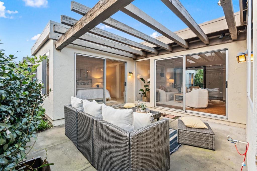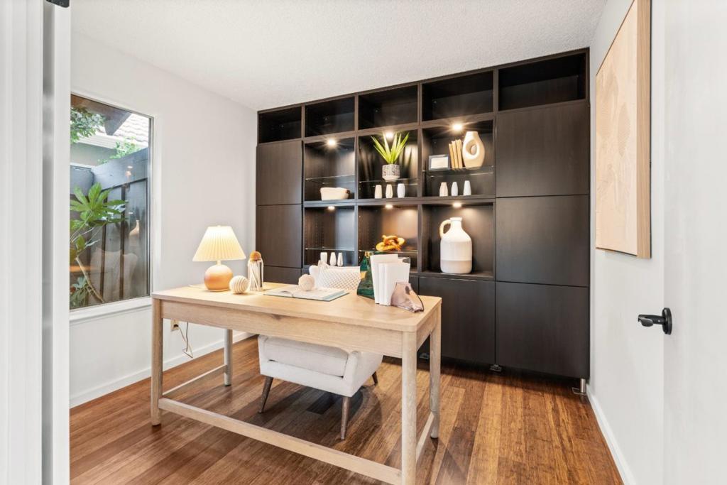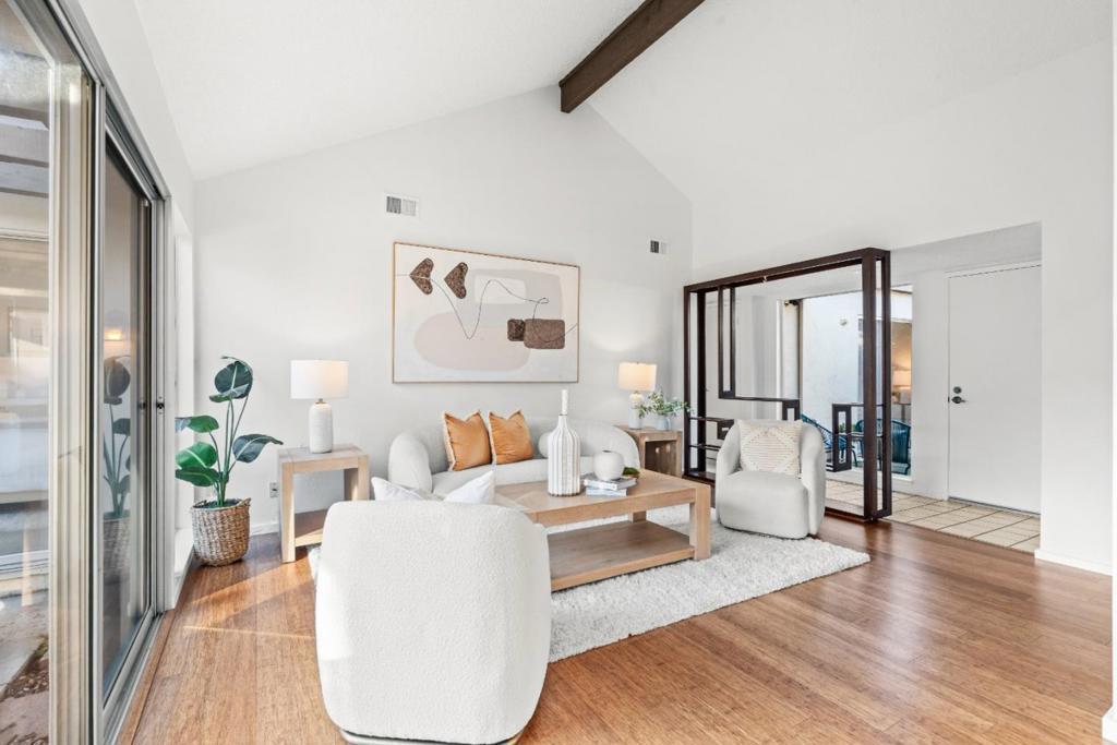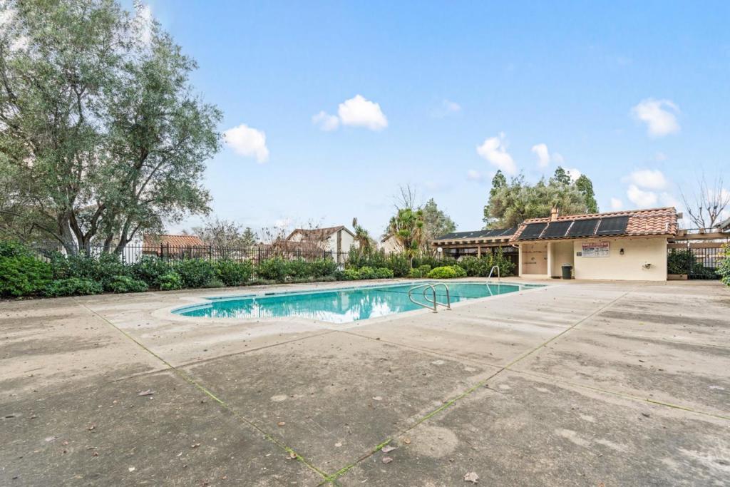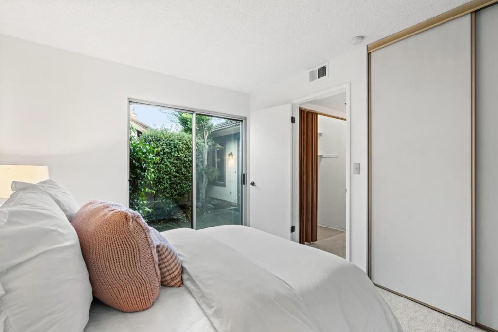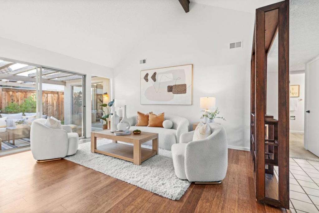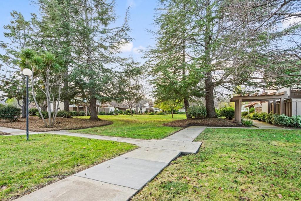 Rare ground-level townhome located within a quiet, park-like community and served by award-winning Cupertino schools. A gated front yard leads to a private courtyard, creating a welcoming and serene entry. Inside, the spacious living room features high ceilings and abundant natural light, flowing seamlessly into the dining area for comfortable everyday living. The updated kitchen offers warm wood cabinetry, granite countertops, a tiled backsplash, and generous counter space and storage. The thoughtfully designed floor plan places two bedrooms along the east wing, while the primary suite is privately situated in the rear wing with direct access to the backyard. A tucked-away third bedroom provides flexibility as a home office, den, or guest space. Additional highlights include an attached two-car garage and an in-unit laundry room. Community amenities include pools, a spa, and tennis courts. Centrally located near Apple, Google, LinkedIn, and other major tech campuses, with convenient access to Lawrence Expressway, Highway 280, and Highway 85.