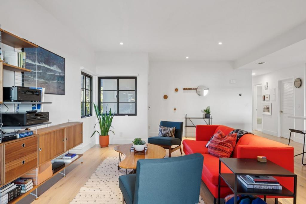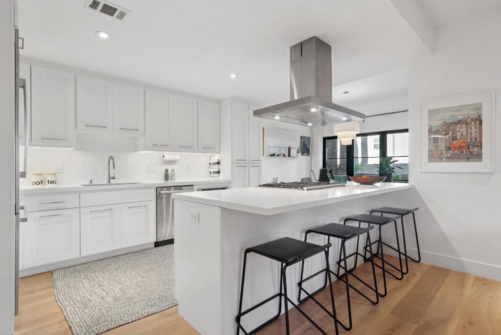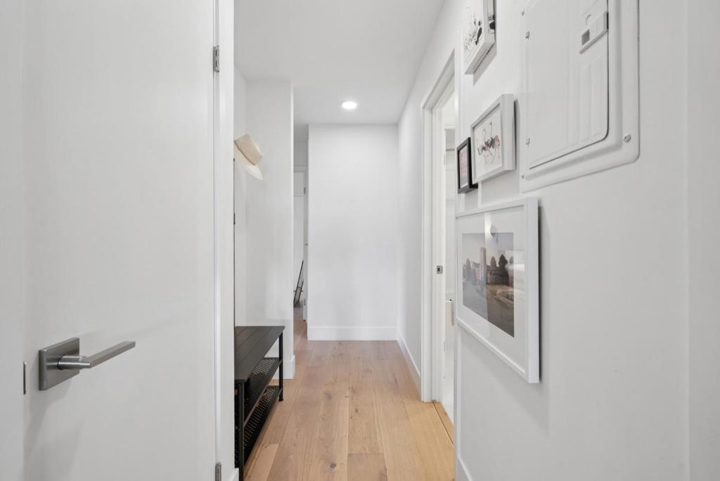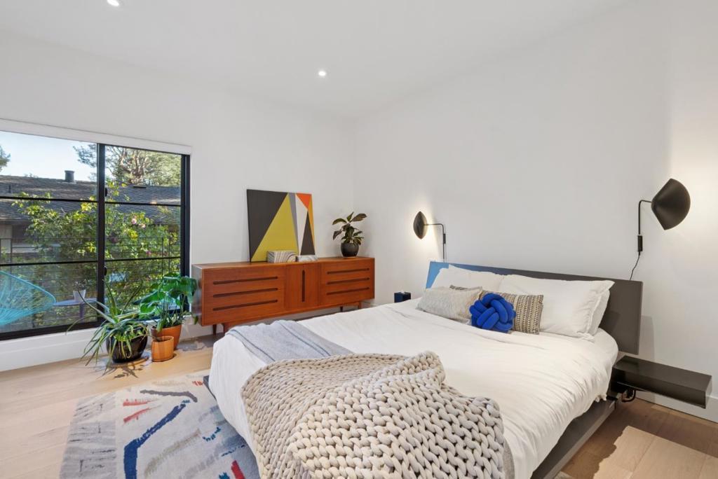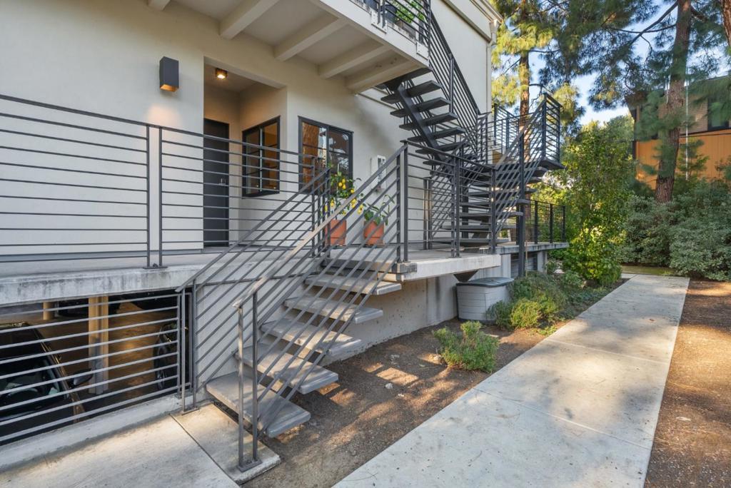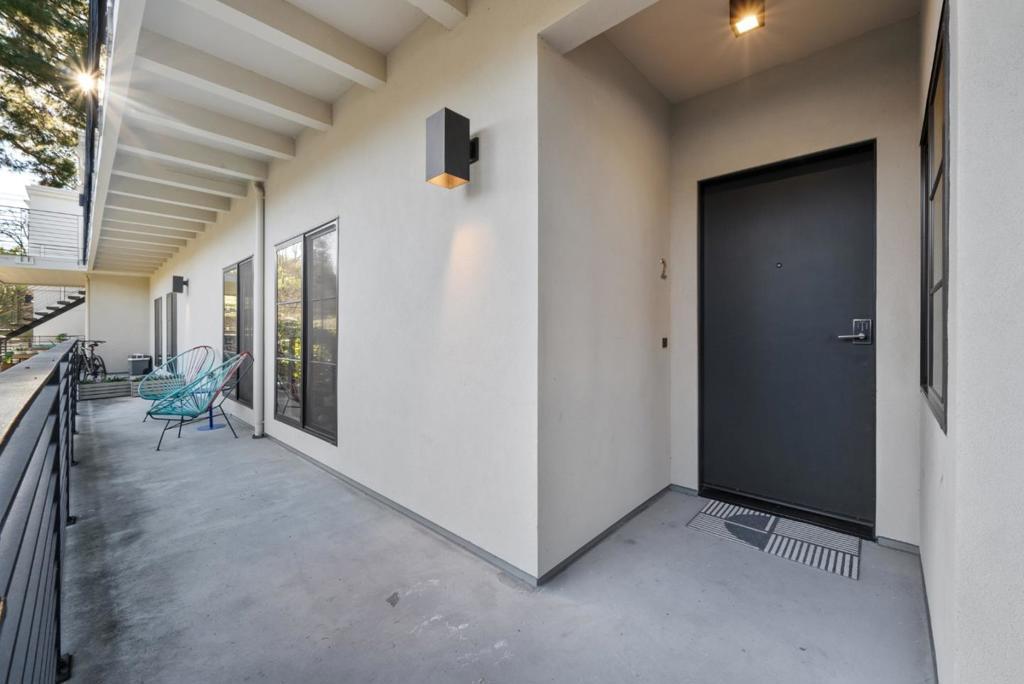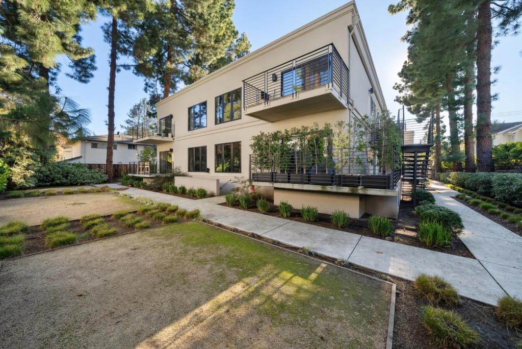 Steps to Downtown Menlo Park, this light and spacious single-level condominium is located in an exclusive small building renovated in 2019. The residence features a private entrance, open living and dining areas with 9' ceilings, contemporary white interiors, wide-plank European hardwood floors, recessed and custom lighting, and double-pane Andersen windows and doors. The expansive chefs kitchen is appointed with professional-grade stainless steel appliances, quality cabinetry, and quartz countertops. Updated bathrooms feature white quartz and tile finishes with chrome fixtures. Additional highlights include a large private wraparound balcony, ample storage, Nest thermostat, and central A/C. The secure building offers two locked pedestrian gates and a secure garage, including two designated parking spaces, EV charger dock, and a private storage room. Set on a large lot with professionally landscaped gardens and an expansive rear greenscape area. Professionally managed and truly one of a kind near downtown West Menlo Park.