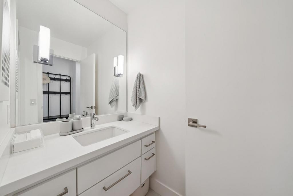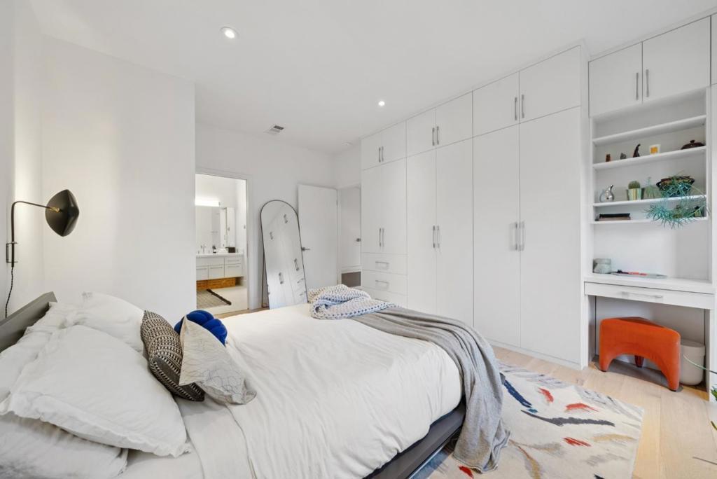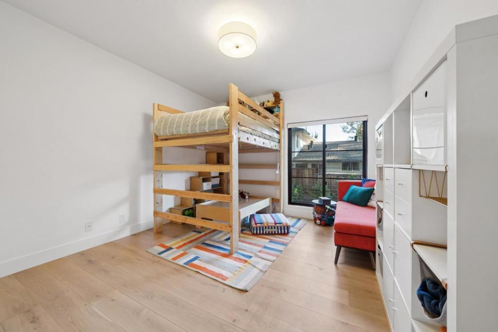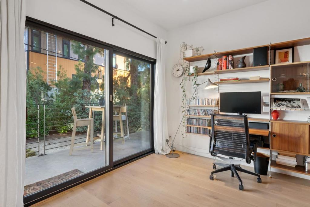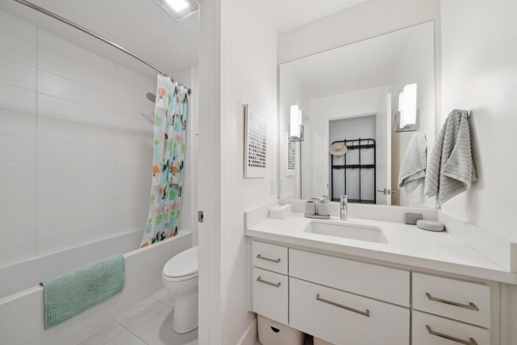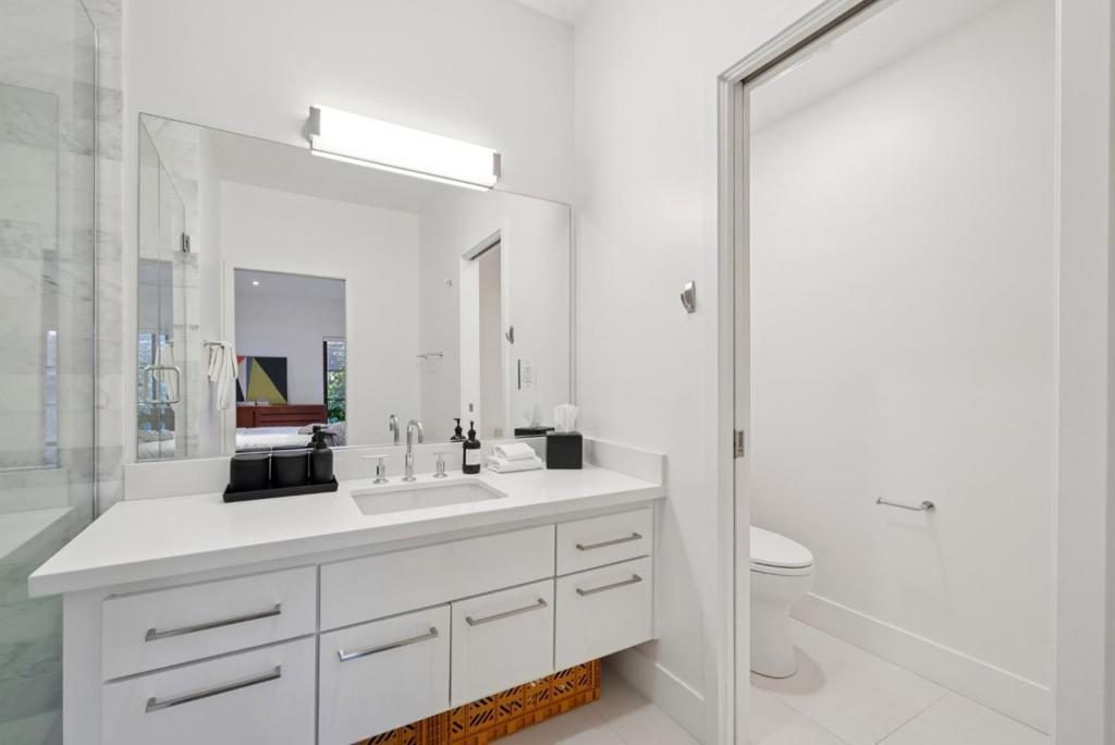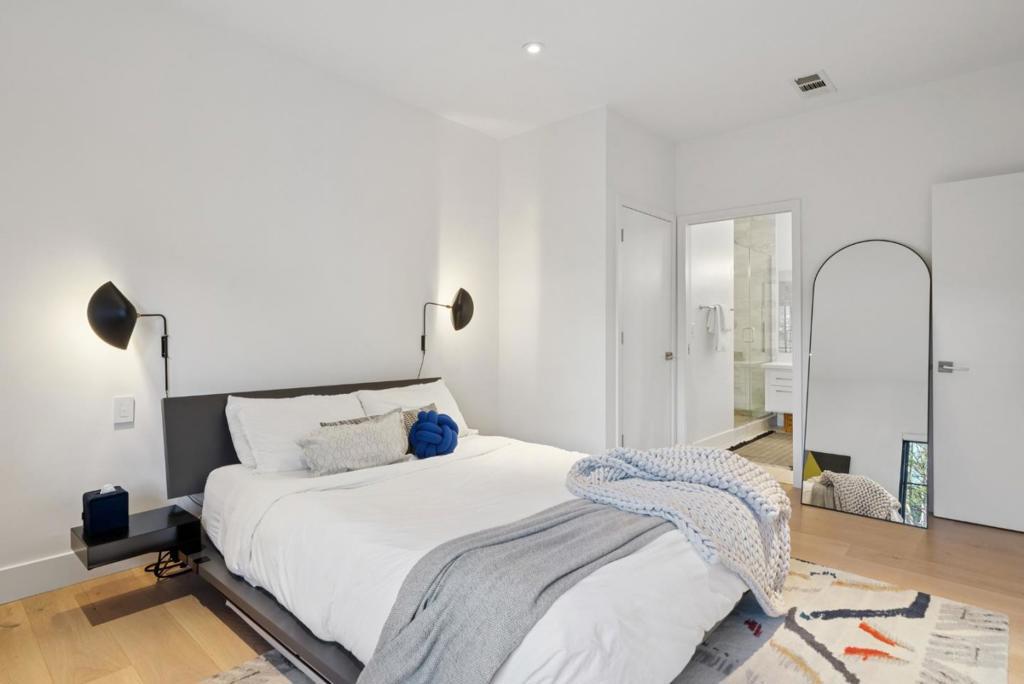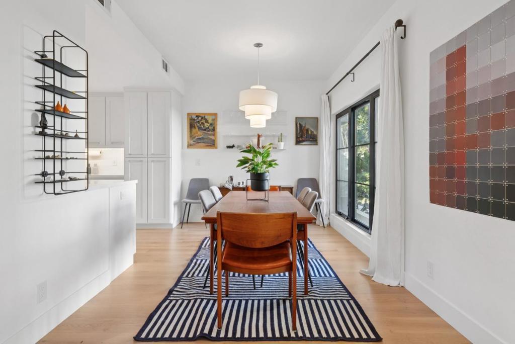 Steps to Downtown Menlo Park, this light and spacious single-level condominium is located in an exclusive small building renovated in 2019. The residence features a private entrance, open living and dining areas with 9' ceilings, contemporary white interiors, wide-plank European hardwood floors, recessed and custom lighting, and double-pane Andersen windows and doors. The expansive chefs kitchen is appointed with professional-grade stainless steel appliances, quality cabinetry, and quartz countertops. Updated bathrooms feature white quartz and tile finishes with chrome fixtures. Additional highlights include a large private wraparound balcony, ample storage, Nest thermostat, and central A/C. The secure building offers two locked pedestrian gates and a secure garage, including two designated parking spaces, EV charger dock, and a private storage room. Set on a large lot with professionally landscaped gardens and an expansive rear greenscape area. Professionally managed and truly one of a kind near downtown West Menlo Park.