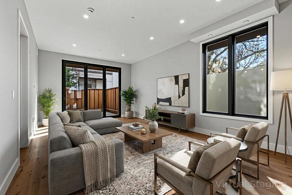 Discover quiet luxury and modern elegance in this exceptional downtown residence. The open-concept living room features soaring ceilings and luxury NanaWall folding glass doors, filling the home with natural light and creating seamless flow between spaces. The chefs kitchen is outfitted with Thermador appliances, integrated refrigerator and dishwasher, and custom wood cabinetry that perfectly blends function and elegance. Engineered wood flooring runs throughout, enhancing the homes clean, modern design. Step outside to an extraordinarily large private backyard, a rare feature for new construction and downtown living, offering exceptional privacy and a true single-family-home feel -- ideal for BBQs, outdoor dining, yoga, or entertaining. Built with enhanced sound-insulation, this home offers exceptional quiet and privacy even in the vibrant city core. Additional highlights include 2 underground parking spaces per unit, EV-charging infrastructure, a gated community with landscaped courtyards. Unbeatable location -- walk to cafes, fine dining, shopping, and Caltrain; minutes to major highways (101, 85, 237), and top tech campuses including Google, Meta, Nvidia, Apple and many more. Live where innovation meets style, enjoy modern elegance in the heart of Silicon Valley.