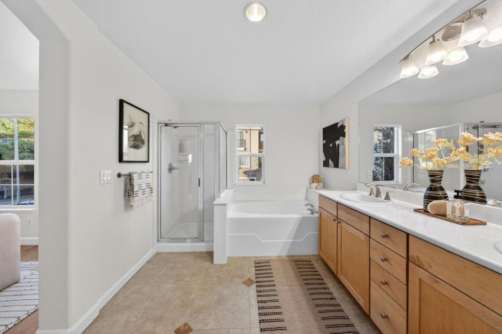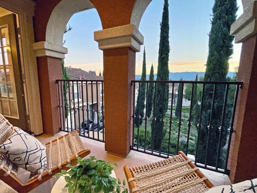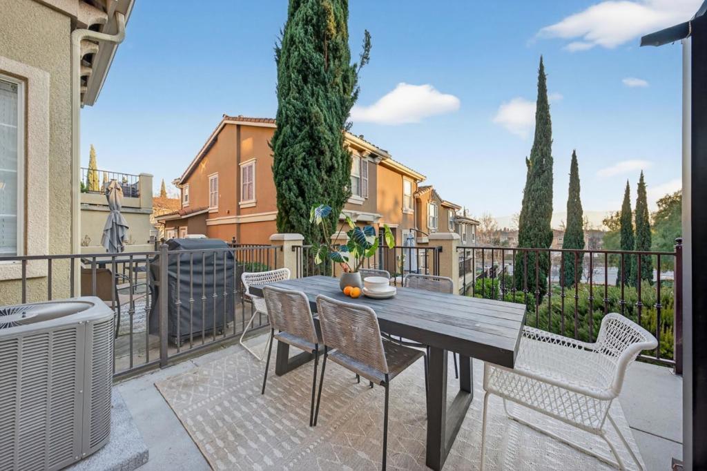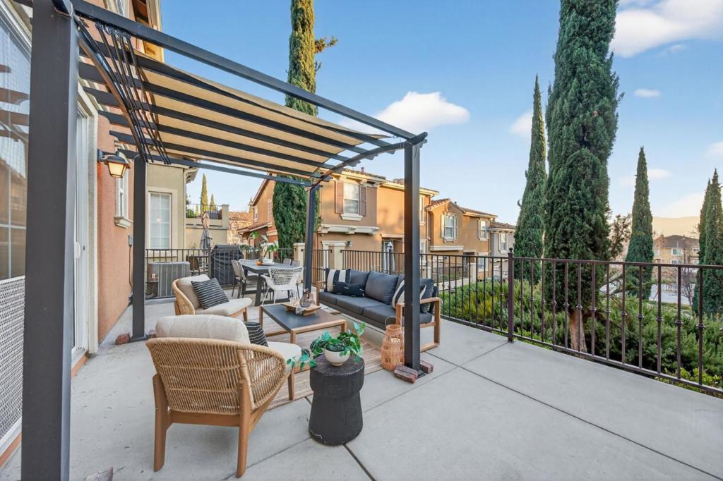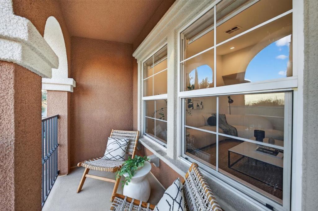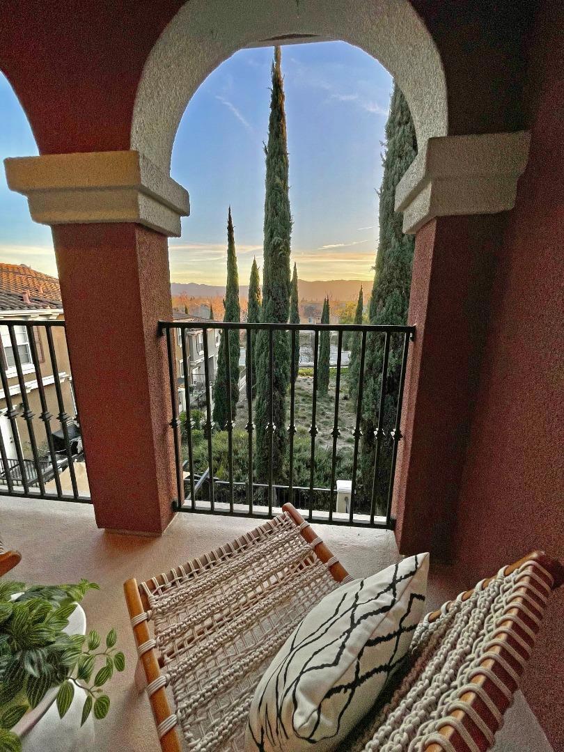 Delightful townhome with wonderful natural light in Tuscany Hills! Enjoy the sunset with your favorite beverage and appetizer on the incredible oversized veranda overlooking open space with views of the hills; this combination of views and the size of the veranda is special and unique within the community. Inside, you'll enjoy vaulted ceilings and an open-concept kitchen and dining area which faces the living room and has access to an additional arch-framed balcony - another ideal spot to enjoy your views! The primary suite, with its large private bathroom (soaking tub, dual sinks and stall shower) and walk in closet is located conveniently on this main level. Two other bedrooms are down the steps off the home's entry. Each of the three bedrooms feels separated and private, making this a very flexible floor plan, conducive to guests staying over, creating private office/work space, or even creating a second living space in the downstairs room that opens to the veranda. The two car garage faces the street for easy access. The Tuscany Hills community is attractive and popular and is known for its beautiful, hilly walking routes and "Grand Staircase" so that you can hit all your new year's goals! Reasonable HOA dues too!