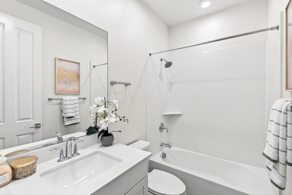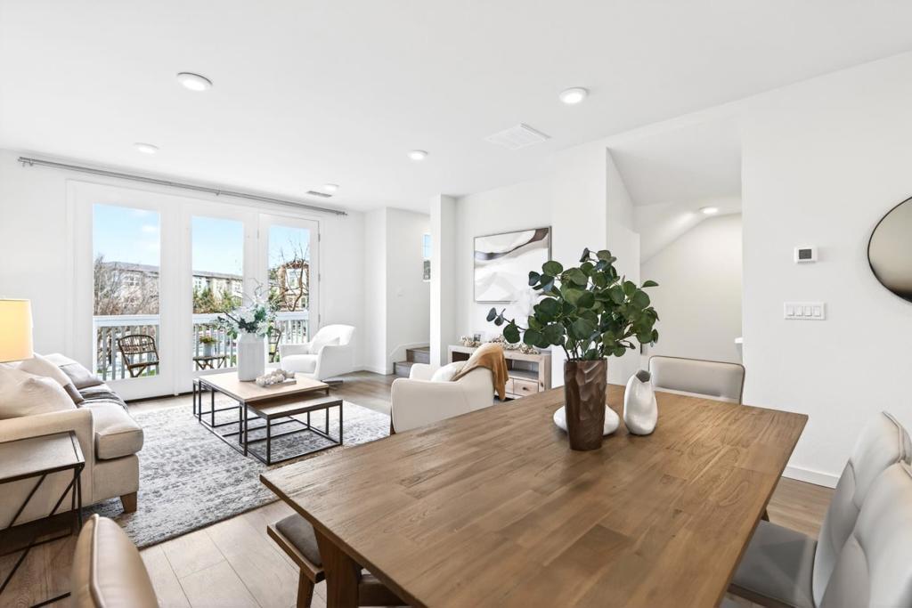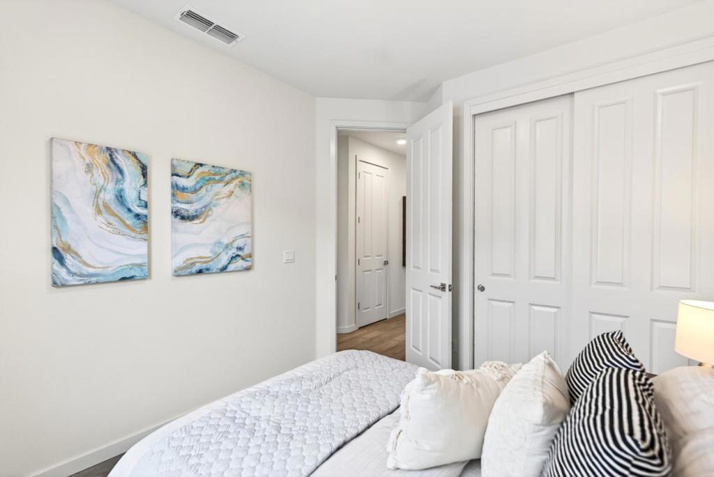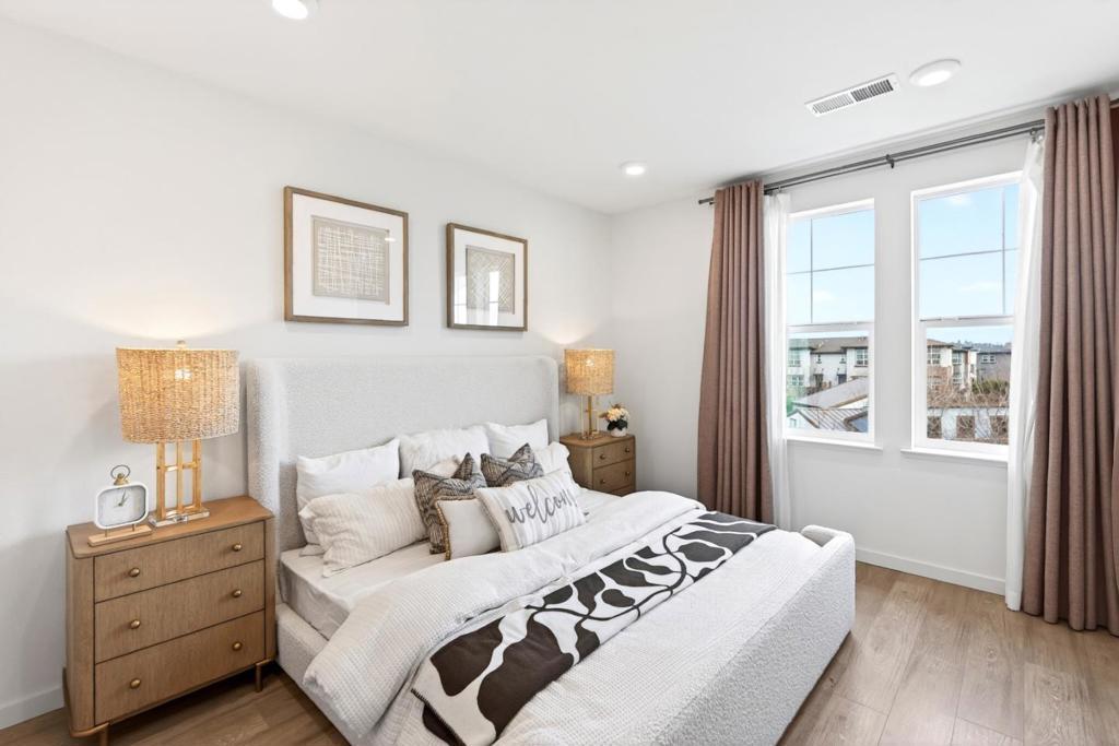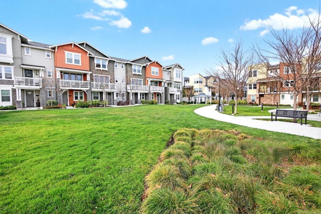 This towering three-story townhome is set within a serene community, fronting a large grassy courtyard and featuring a convenient clubhouse ideal for relaxing or socializing. Enjoy a walkable lifestyle with several nearby parks, including the new Magical Bridge Playground and just a few miles from downtown Sunnyvale with its weekly farmers market and Caltrain connection. Upon entry, laminate flooring leads you to a versatile ground-level office, a half bath, and direct access to the two-car garage. The second level offers an airy open floor plan with high ceilings and recessed lighting, featuring a sun-filled living room with access to a private balcony overlooking the greenbelt, a dining area, and a beautifully appointed kitchen with quartz countertops, center island, extensive cabinetry, a massive pantry, and an additional half bath. The third level hosts all generously sized bedrooms, each with its own closet. The primary suite features a glorious walk-in closet and a spa-like en-suite bathroom. Ideally located near major tech campuses including LinkedIn, Google, and Apple, with convenient access to Highway 101, Central and Lawrence Expressways. Do not miss your chance to own this towering townhome. It will go FAST!