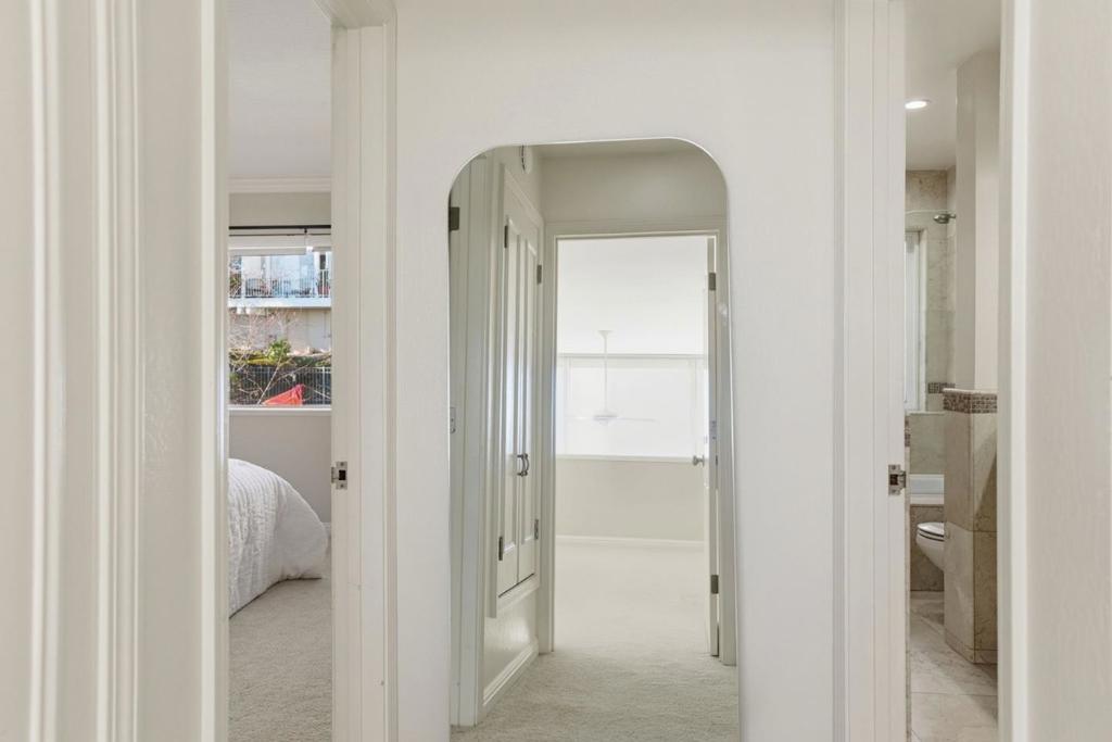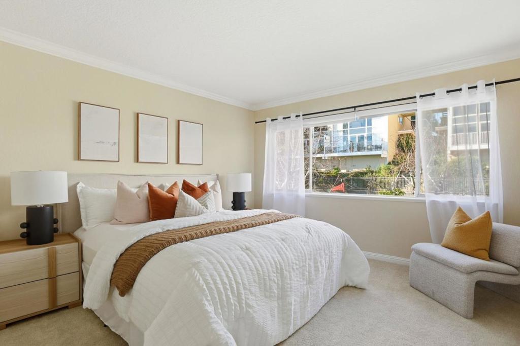 Nestled in the picturesque San Carlos Hills, this light-filled upper-level residence offers breathtaking panoramic views of the Bay and Silicon Valley. With soaring 18-foot ceilings and floor-to-ceiling windows, the home is bathed in natural light throughout its contemporary two-story layout. The spacious living area, equipped with a flexible dining room that can be converted into a third bedroom or home office, is complemented by a loft-style bedroom overlooking the living space, providing sweeping views. The main level features a cozy living room, a fully equipped kitchen, a dining area, a full bath, an in-unit laundry room, and a private balcony, perfect for enjoying peaceful days with frequent sightings of deer and hummingbirds. For added comfort, the home is equipped with a Nest thermostat, a new furnace, and cellular electric blinds. Residents have easy access to nearby trails and a dog park, while still being close to top-rated San Carlos schools, charming downtown shops and dining options, major tech campuses, Caltrain, and highways. The property includes two deeded parking spaces and HOA amenities, such as a tranquil pool within an intimate 36-unit complex.