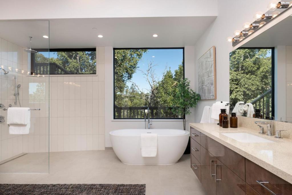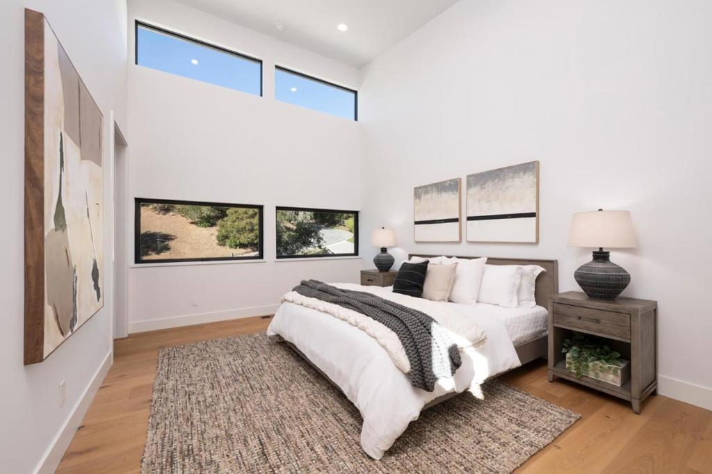 Welcome to 45 Calaveras Court, a brand-new modern masterpiece nestled in the Hillsborough hills. Located at the end of a private cul-de-sac on a sizable 4-acre lot, this stunning residence offers approximately 7,000 square feet of elegantly designed living space. Enjoy unobstructed canyon views from every window, providing a breathtaking backdrop to your everyday life. Step inside to discover soaring ceilings that create an open and inviting atmosphere, complemented by an abundance of natural light that fills every corner. The expansive first floor features a massive entertainment deck, perfect for hosting gatherings or simply relaxing amidst nature. With a total of 8 bedrooms, including master suites on each level, this exceptional home is perfect for large families or multi-generation living.