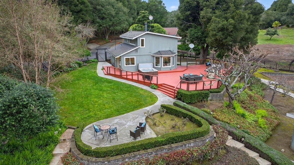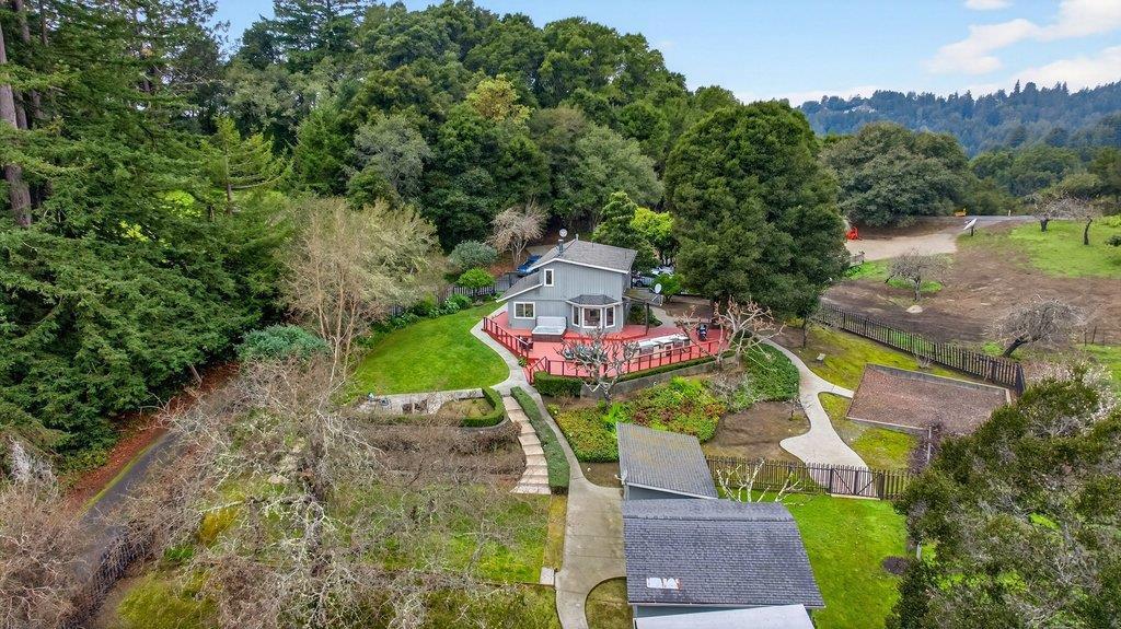 This peaceful mountain home truly feels like a private retreat. Less than 10 minutes to Aptos village and up a shared driveway with only 1 other property, this cozy and charming home rests on a sunny lot with a large fenced yard and plenty of open land for work and play. The expansive ground level deck looks out over manicured lawns, a private orchard with dozens of fruit trees, extra storage sheds, views of redwood groves and lighted patios and pathways that wind throughout the fenced portion of the property. The land beyond the fence is gently sloping with endless possibilities, plenty of space for future garages, barns or other structures. There is plenty of space for parking and oversized vehicles. The outdoor kitchen and deck are perfect for entertaining and backyard barbecues. Take in the night sky while you soak in your private hot tub. The home itself enjoys abundant sunshine coming through the dual pane windows. Inset lighting brightens the home at night while the wood burning stove keeps you warm in the winters. There is new waterproof flooring, fresh carpet and paint, a tankless water heater, long lasting architectural roofing (new in 2018) and a wheel chair friendly access to the ground floor bedroom and bathroom. This wooded oasis and mountain haven is a must see!