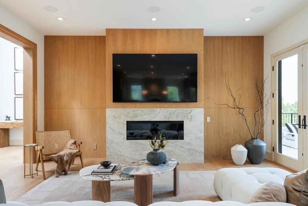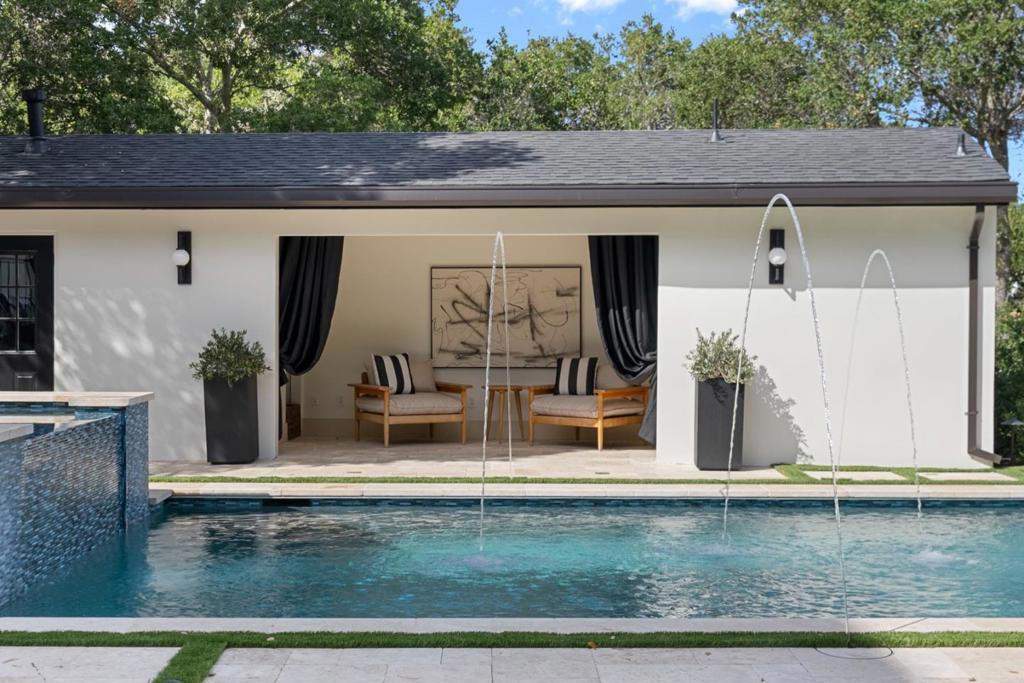 Striking modern estate offering the perfect blend of luxury, scale, and design. This full scale renovation showcases soaring ceilings, dramatic floor-to-ceiling windows, and seamless indoor-outdoor living. The spacious floor plan features grand formal and casual living areas, a sleek chefs kitchen, and walls of glass opening to expansive terraces with serene tree-lined views. Luxury amenities include a private home theatre, gym, tasting room and wine cellar, elevator, and a resort-style backyard with pool house and built-in BBQ. The sparkling pool with water features, multiple lounge areas, and expansive patio create the ultimate setting for entertaining and relaxation.