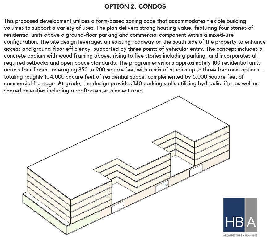 The proposed development offers two compelling housing options designed for modern living and strong community value. Option 1 features 23 three-story townhomes with spacious layouts, enhanced privacy, and a cohesive neighborhood feel, incorporating private yards and rooftop terraces for elevated outdoor living. The site plan maximizes efficiency by utilizing an existing southern roadway and includes three vehicular access points for improved circulation while meeting all setback and open-space requirements. Option 2 presents a mixed-use condo concept under a form-based zoning approach, with four stories of residential units above ground-floor parking and commercial space. This design includes approximately 100 units ranging from studios to three bedrooms, averaging 850 to 900 square feet, totaling about 104,000 square feet, along with 6,000 square feet of commercial frontage. Built with a concrete podium and wood framing above, the five-story structure incorporates 140 parking stalls with hydraulic lifts and shared rooftop amenities, delivering a flexible, efficient, and vibrant residential environment.
