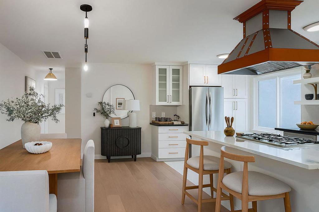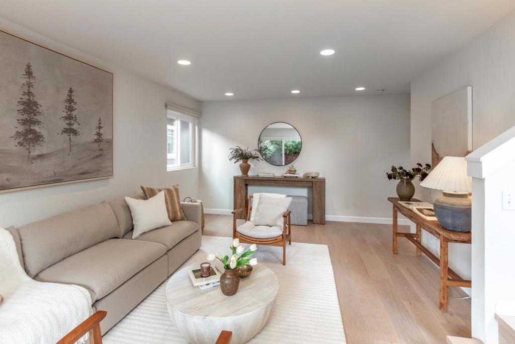 Beautifully remodeled with turnkey appeal, this North Fair Oaks gem showcases modern livability midway between Silicon Valley and San Francisco. The flexible two-story layout features two bedrooms and two remodeled baths, all enhanced by a palette of soft designer colors and white oak engineered hardwood floors. The open living area at the entrance has a modern chandelier and connects seamlessly to the sleek kitchen with a quartzite-topped peninsula with counter seating, custom suspended vent hood, and stainless steel appliances. At the rear of the home is a spacious family room that opens to the private paver-finished rear yard. A main-level bedroom and bath are complemented by the upstairs primary suite with walk-in closet, western hill views, and well-appointed bathroom. Smart features include a Ring doorbell, keyless front entry, and a smart thermostat along with central air conditioning. Roses, geraniums, and a camellia enliven the setting, which has ample off-street parking and an attached 1-car garage. Just blocks from the Redwood City Stanford campus and minutes to Meta headquarters and Highway 101.