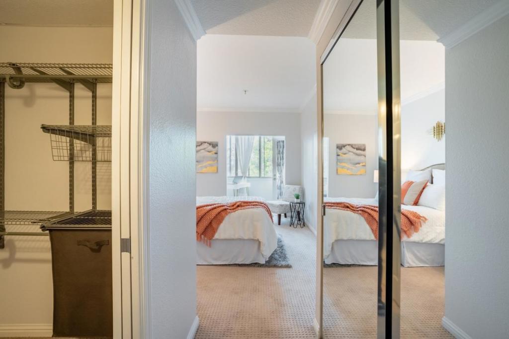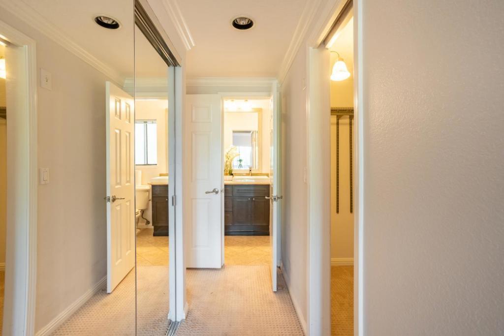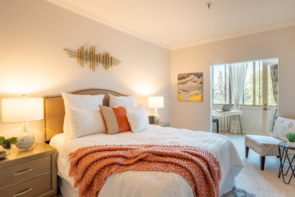 Beautiful starter home located in a prime central location in Santa Clara. High ceilings, large windows with an abundance of natural light. Airy and open living room w/fireplace. Nice kitchen with granite countertops and stainless steel appliances. Spacious master suite offers oversized dual sink vanities, walk-in closets, and bonus area which could function as a great home office. In-unit washer/dryer, Central heating and A/C, plenty of guest parking. Secured complex with swimming pool, sauna, jacuzzi, weight room & outdoor BBQ area. Walking distance to Agnew Park, Levi's Stadium, Great America & Rivermark Plaza. Minutes away from 101 & 237, tech companies and schools.