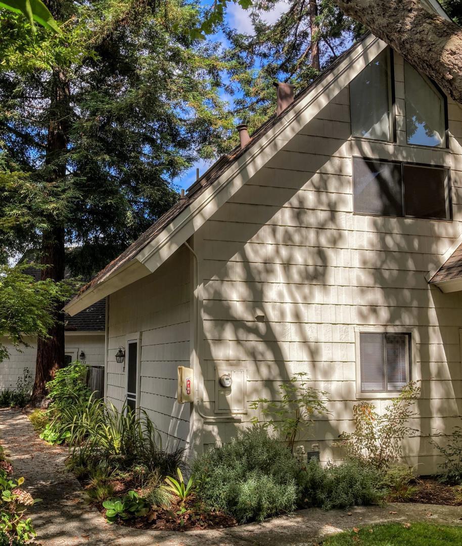 In the heart of Silicon Valley, this charming chalet style condo is surrounded by redwood trees, in a tranquil, small community with 22 units surrounded by a beautiful lush landscaped garden. Spacious living room with lots of natural light and fireplace that opens into the kitchen area and into a large backyard. Dining area is adjacent to the kitchen. Downstairs also offers a half bath and laundry area with hookups. Two bedrooms upstairs with vaulted ceilings, and a full bath. Complex also has a shared laundry facility. Two deeded parking spots, plus extra storage. One block from Palo Alto. Conveniently close to Starbucks, a nearby park, Caltrain, Google, Facebook, Stanford and downtown Palo Alto.