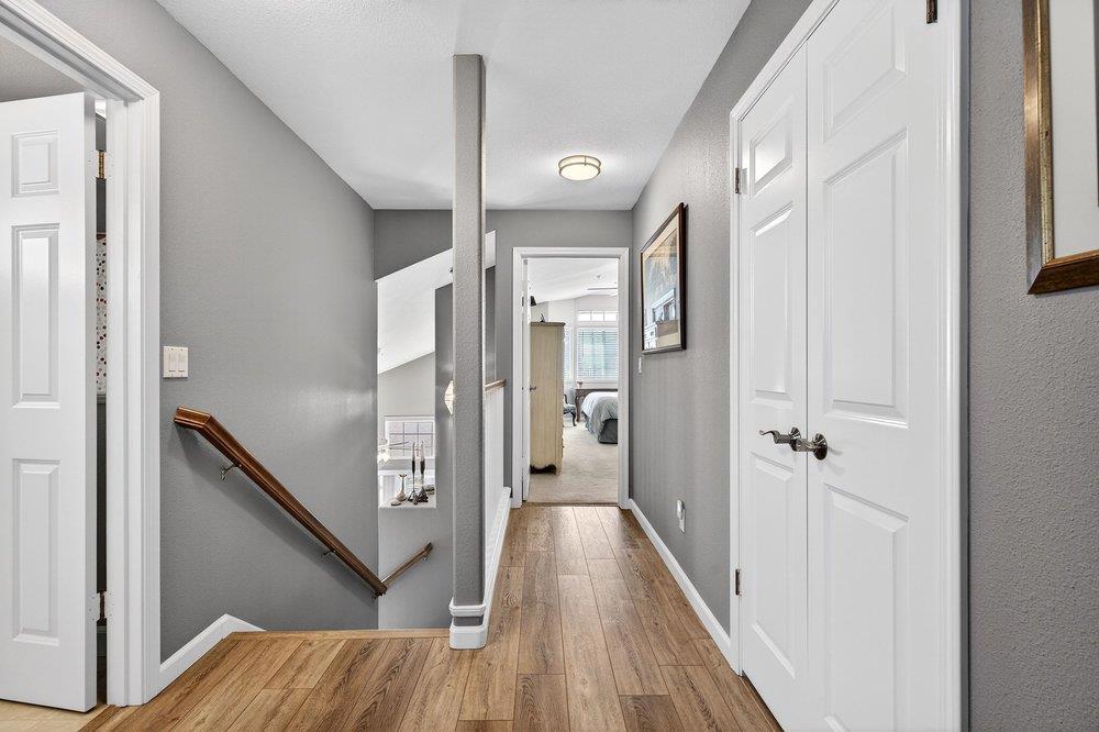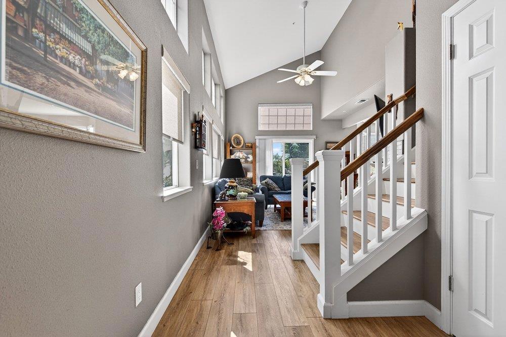 Welcome to the highly sought after, gated Montclair community. This beautifully updated 3-bedroom, 2.5-bath home is truly move-in ready, featuring luxury vinyl plank flooring, fresh carpet and paint, a new water heater, and a tastefully renovated kitchen with quartzite counters. The location offers exceptional privacy with no neighbors behind and single-story homes on both sides. Tucked away in the desirable Harden Ranch area, you're just minutes from shopping, dining, and everyday conveniences. A gated private courtyard creates a warm welcome, while the backyard is a true retreat with a spacious deck, sauna, hot tub, and fire pitperfect for relaxing or entertaining. Upstairs, you'll find three generously sized bedrooms, which includes a primary suite with a soaking tub, separate shower, and an opening skylight that fills the space with natural light and fresh air. A must-see home in an unbeatable location.