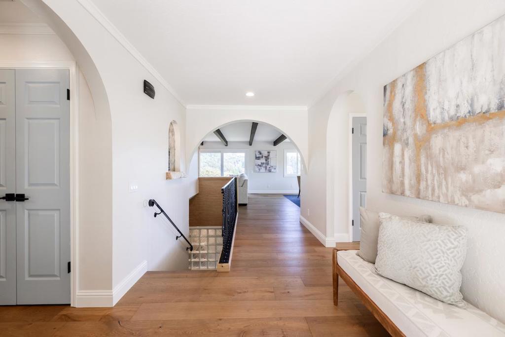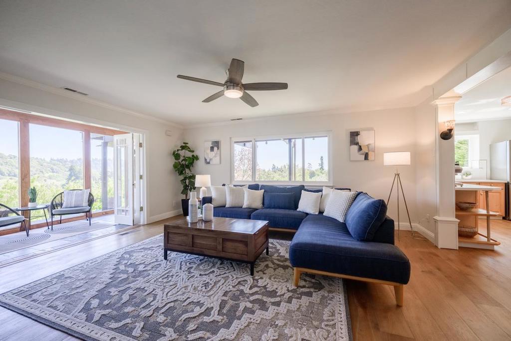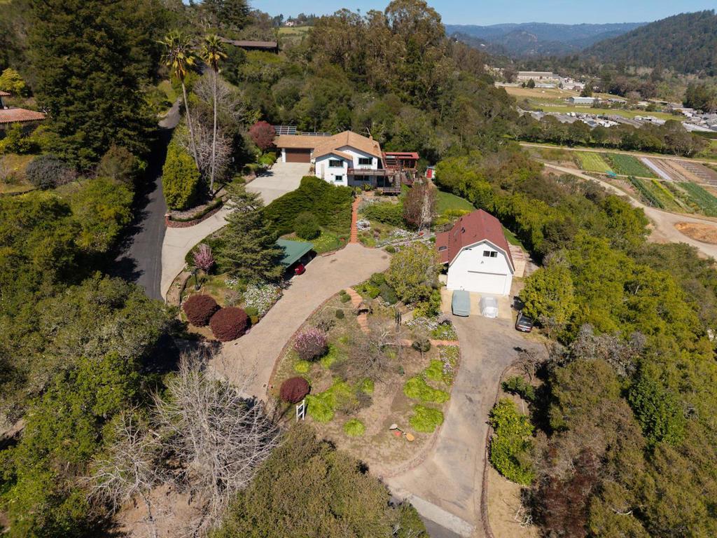 Fantastic estate with ocean views to Monterey on 1.5+ acres! Main home features two beautifully remodeled living levels, each offering stunning 2 bed/2 bath layouts with kitchens and living rooms. The upstairs level also includes a private office and wrap-around deck perfect for enjoying breathtaking sunsets. Inside youll find quality finishes throughout including European white oak engineered hardwood floors, quartz countertops, stainless steel appliances, and vaulted wood-beam ceilings. Main level includes a spacious living room with gas fireplace, dining area, elegant kitchen, and a primary suite with dual closets, double-sink vanity, large shower, and private deck access. The lower level offers a separate entrance, sunroom, French doors to the living area, a gorgeous kitchen with quartz counters, wood cabinetry, and large pantry, plus two spacious bedrooms including one with en-suite bath. There's also includes a beautifully remodeled 1 bed/1 bath ADU above a 1,000+ sq ft detached workshop. Exceptional outdoors spaces with multiple IPE decks, flagstone paths, landscaped grounds, and a one-of-a-kind English pub imported from Englandfully equipped and perfect for entertaining. Owned solar, water softener, and gray water system. Minutes to downtown Soquel and local beaches.