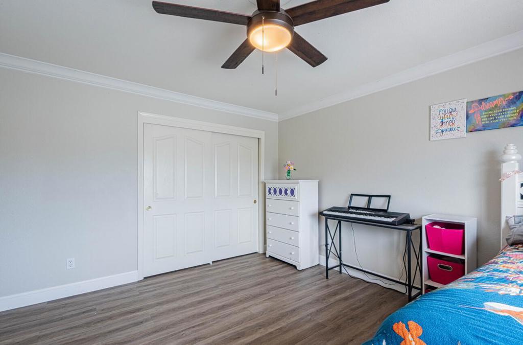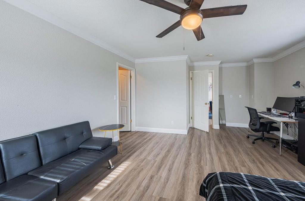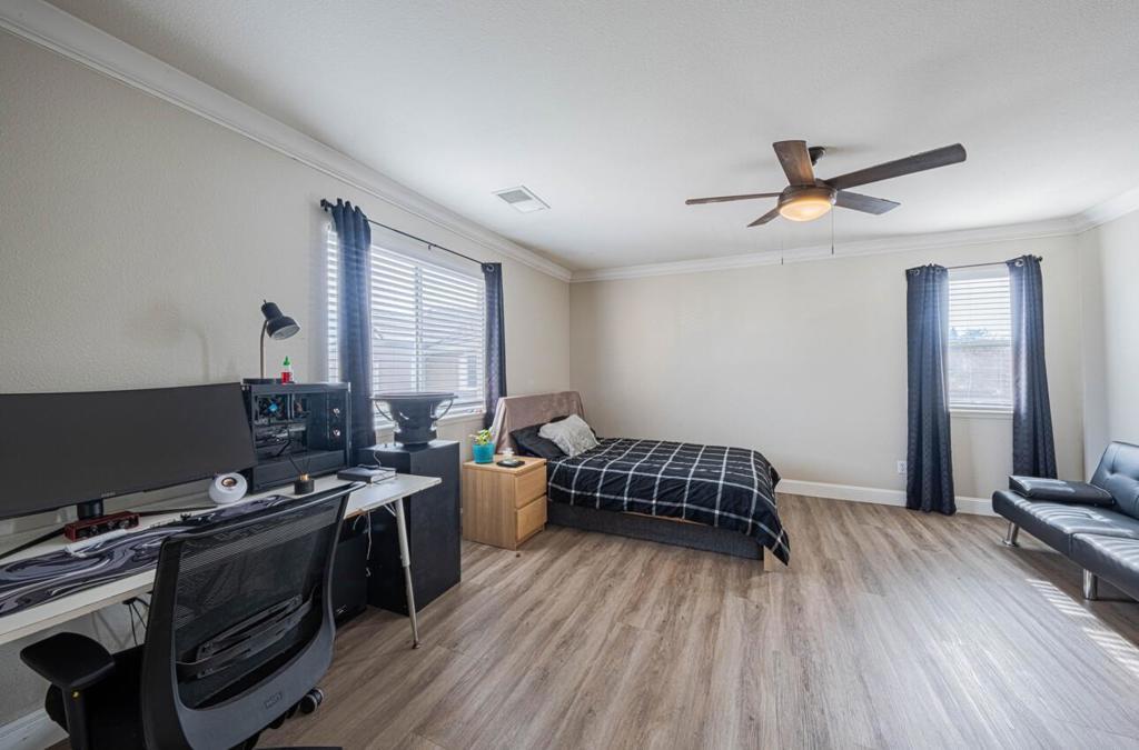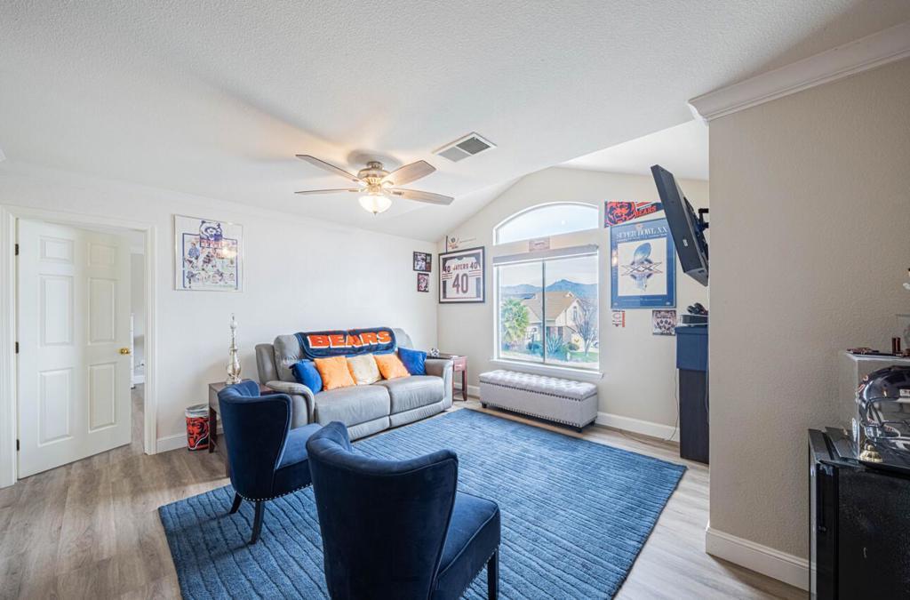 Welcome to this beautifully upgraded residence offering refined comfort, thoughtful design, and exceptional indoor-outdoor living. Featuring 4 bedrooms and 3 bathrooms, with a loft converted to a 5th bedroom, including a highly desirable downstairs bedroom, this home is ideal for flexible living arrangements. The updated kitchen showcases sleek cabinetry, quartz countertops, designer tile backsplash, and stainless steel appliances, including a new stove, oven, exhaust hood, and dishwasher. Downstairs living areas feature elegant tile flooring, while upstairs offers stylish LVP flooring. Crown molding and 6-inch baseboards throughout add a timeless, upscale finish. An optional 5th bedroom has been added in the loft area while still preserving the open loft space, providing versatility for a home office, guest suite, or media room. The primary suite features an updated shower, complemented by upgraded lighting and ceiling fans throughout the home. Step outside to an expansive backyard retreat with a swimming pool, multiple raised garden beds, mature orange trees, and a beautifully curated succulent garden perfect for entertaining or peaceful relaxation. Enjoy a quiet setting with mountain views and breathtaking sunrises.