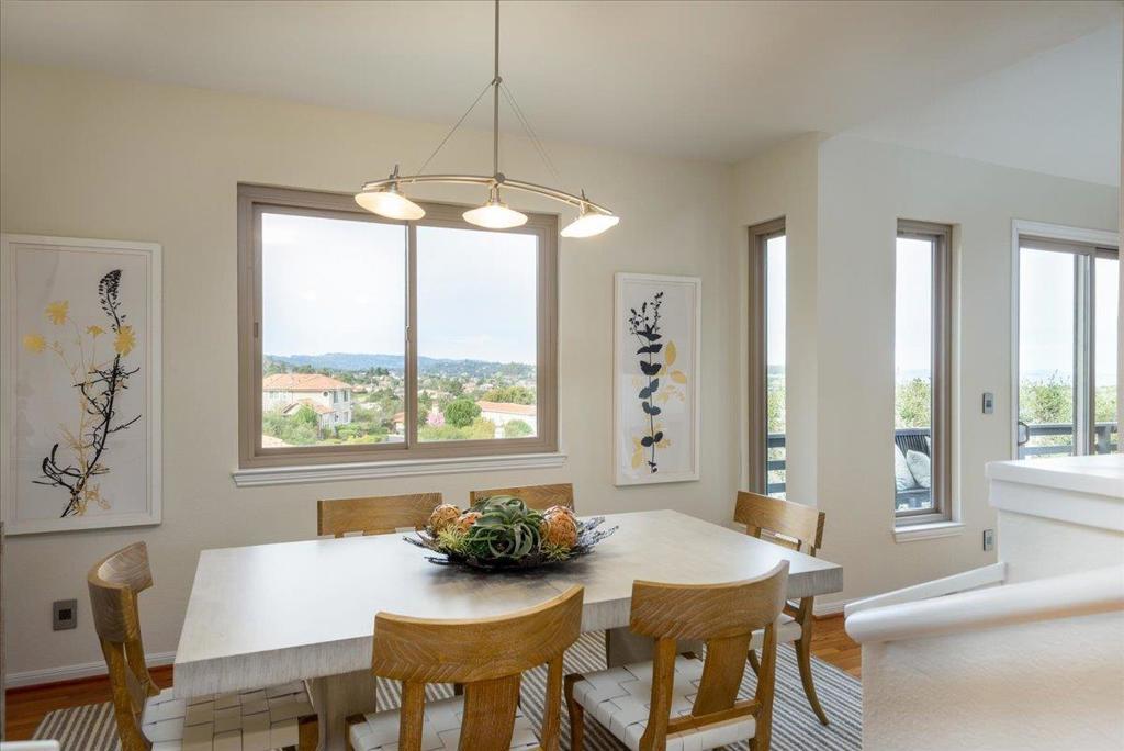 Perched in the hills of Belmont, this stunning multi-level home offers 3 bedrooms, 2.5 baths, a versatile loft, and jaw-dropping panoramic views of the San Francisco Bay, Bridges and SF Skyline. The open, light-filled design takes full advantage of its scenic setting. The living room wows with soaring ceilings, a cozy fireplace, and expansive windows framing the bay. A sleek kitchen with European cabinetry, granite counters, breakfast bar flows into a casual breakfast area and a formal dining room perfect for any occasion. The spacious family room invites relaxation, while the lower level features two bedrooms, a full bath with a luxurious jet tub, and convenient laundry and storage spaces. The top-level primary suite is a private retreat with a balcony, custom walk-in closet, and a spa-like bath adorned with Porcelanosa tiles and premium finishes. A loft space completes the upper floor, ideal for work or unwinding. Hardwood and wood floors, Italian light fixtures, and fresh paint inside and out add modern style throughout. Conveniently close to top-rated schools, parks, shopping, and commute routes, this home is a perfect blend of beauty and practicality. Don't miss it!