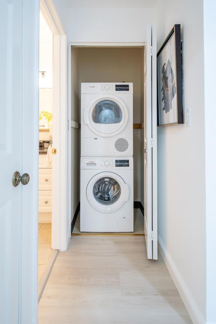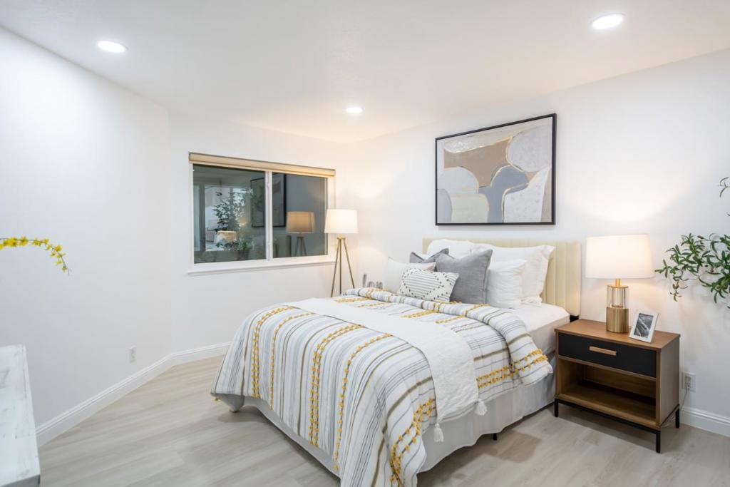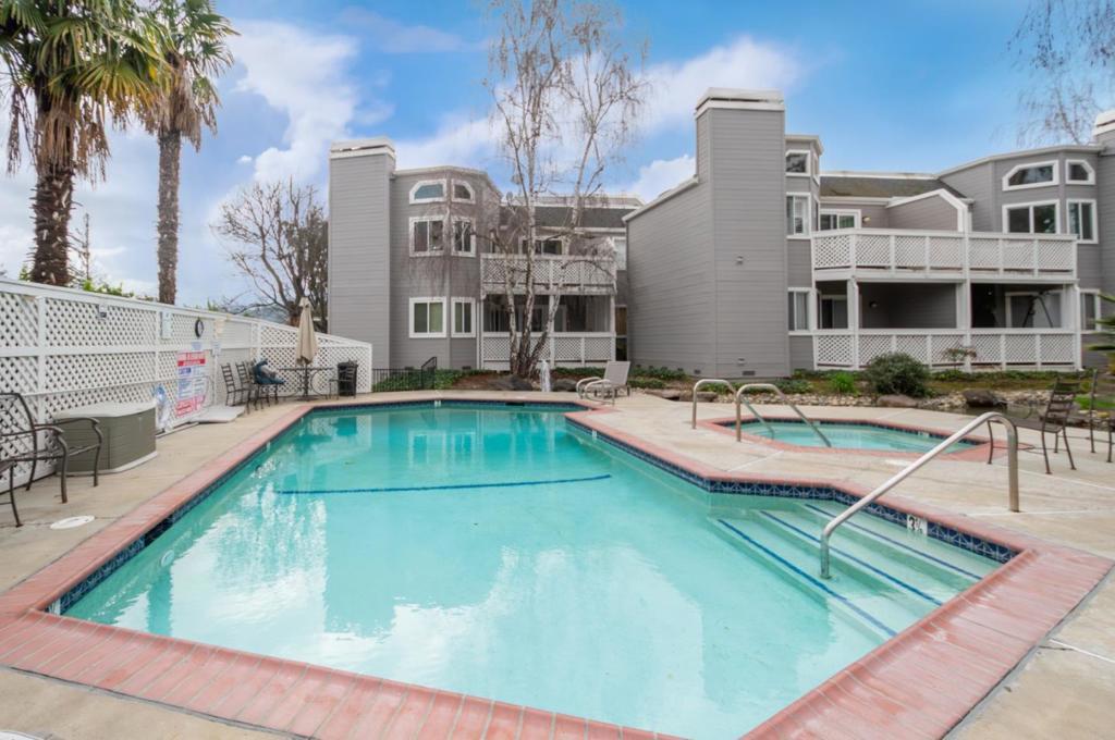 An incredible chance to own this charming condo in serene Lakeside Commons. This two-story home offers 2 bedrooms, 2 bathrooms, and 1,212 SF of living space on a 1,980 SF lot. External stairs lead to a deck entrance opening to a bright, airy floorplan. The interior boasts new paint and flooring, while the spacious living room is filled with natural light through dual-pane windows. The recessed lighting and electric fireplace create a cozy atmosphere. The semi-open kitchen has modern appliances including brand new refrigerator, granite countertops, and a dining area with built-in cabinets. Sliding doors open to a balcony overlooking the pool. First floor also offers a bedroom, bath, and laundry with a washer/dryer. Upstairs features a bedroom with a closet, en-suite bathroom with a standing shower, tiled walls, and a vanity. Additional amenities: 1-car garage, designated carport, pool, spa, gardens, ponds, guest parking. Located in desirable Cambrian Park, very close to Los Gatos downtown with San Jose prices. Walking distance to top schools such as Carlton/Union/Leigh. Nearby Norman Y. Mineta Highway, parks and hospitals provided convenient commuting and living.