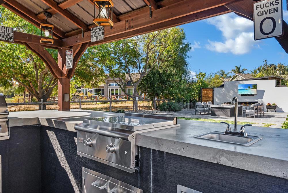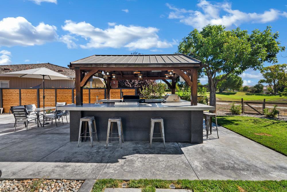 Entertainers Paradise with Seamless Indoor-Outdoor Living: This residence blends sophisticated style with functionality. The well-appointed office & custom fish tank create a distinctive first impression, leading into an expansive great room anchored by timeless flooring & walls of windows that fill the space with natural light. The open layout flows effortlessly into a spacious dining area & a gourmet kitchen curated for everyday living & gatherings. Quartz countertops, professional-grade stainless steel appliances, a built-in refrigerator, generous prep surfaces, & abundant cabinetry provide both beauty & performance. Technology enhances the experience with app-controlled window coverings and an integrated smart system that manages heating & cooling for tailored comfort. The primary suite offers a private retreat w generous closet space & a spa-inspired bath. All bathrooms include bidets for added convenience. The sliding glass doors open to a covered patio overlooking a built-in fire pit and golf course views off the great room. The 12x14 outdoor kitchen is fully equipped with a smoker, flat grill, BBQ, lighting. Lots of upgrades include epoxy garage floors, a generator, stamped concrete, 200 amp electrical panel, dog run, spa, double sided fireplace, hunter douglas shades