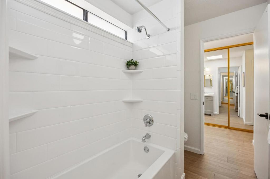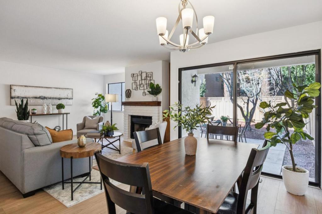 Welcome to this beautifully appointed 2-bedroom, 1.5-bath townhome-style residence offering approximately 1,294 square feet of refined living space in the desirable Rancho Palma Grande community of Santa Clara. Thoughtfully updated and meticulously maintained, this home blends modern sophistication with everyday comfort. The main level features an inviting open-concept living area anchored by a cozy fireplace and sliding glass doors that open to a spacious private yard. Ideal for entertaining or relaxing, the yard offers rare outdoor space for this style of home and includes automatic sprinklers for easy upkeep. The kitchen has been tastefully upgraded with contemporary cabinetry, sleek countertops, luxury vinyl plank flooring, and stainless steel appliances. A remodeled powder room completes the main level. Upstairs, two spacious bedrooms offer tranquil treetop views and generous closet space. Each includes its own remodeled vanity and connects to a shared full bath designed for privacy and functionality. An attached two-car garage adds convenience and value. Residents of Rancho Palma Grande enjoy access to a pool and spa. Ideally located near NVIDIA, AMD, Intel, Applied Materials, and ServiceNow, with easy access to San Tomas Expressway and Highway 101.