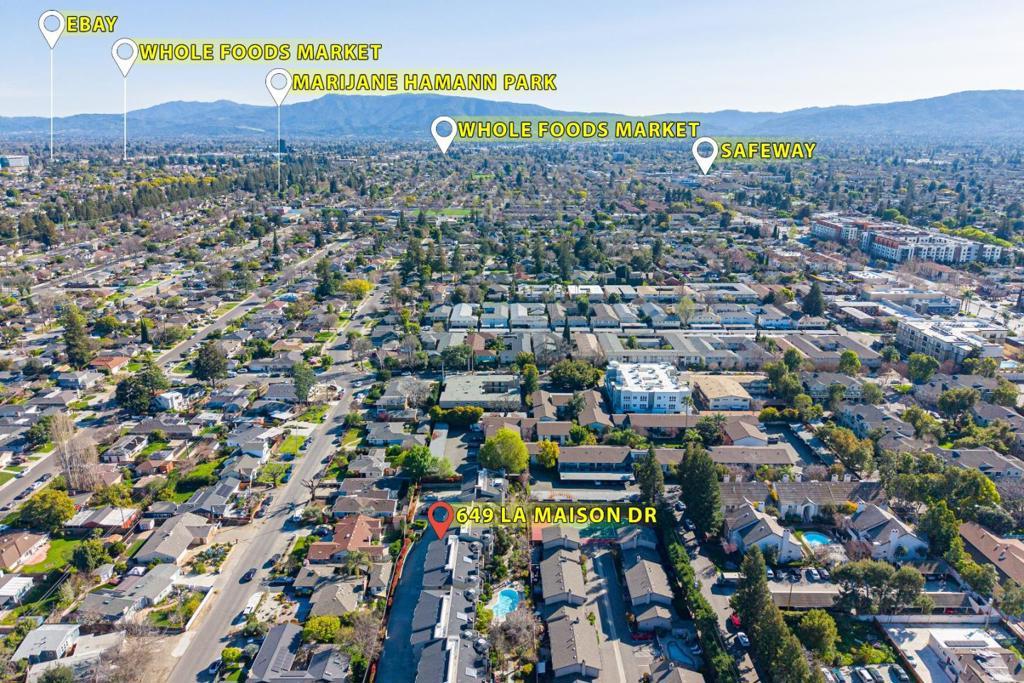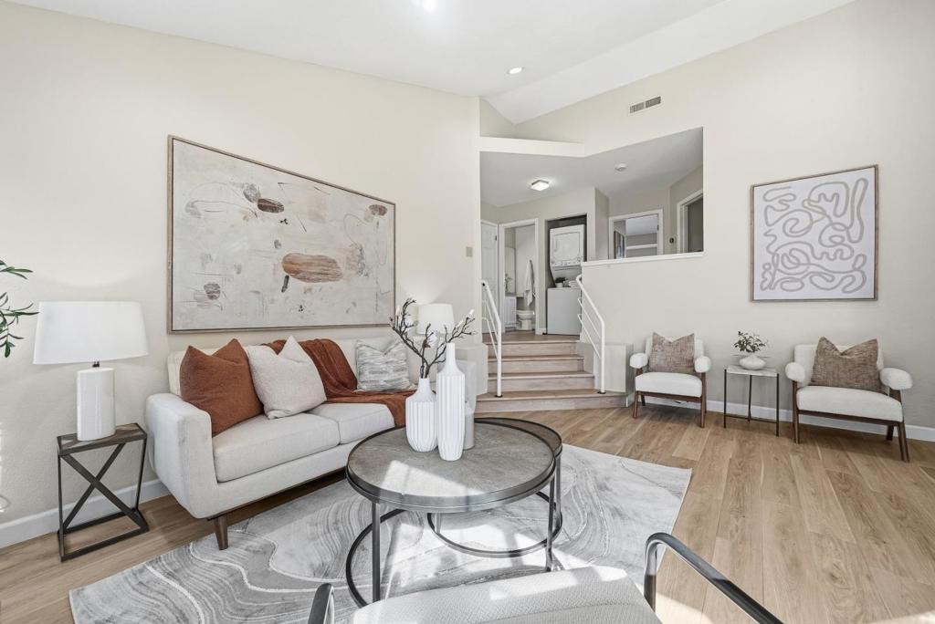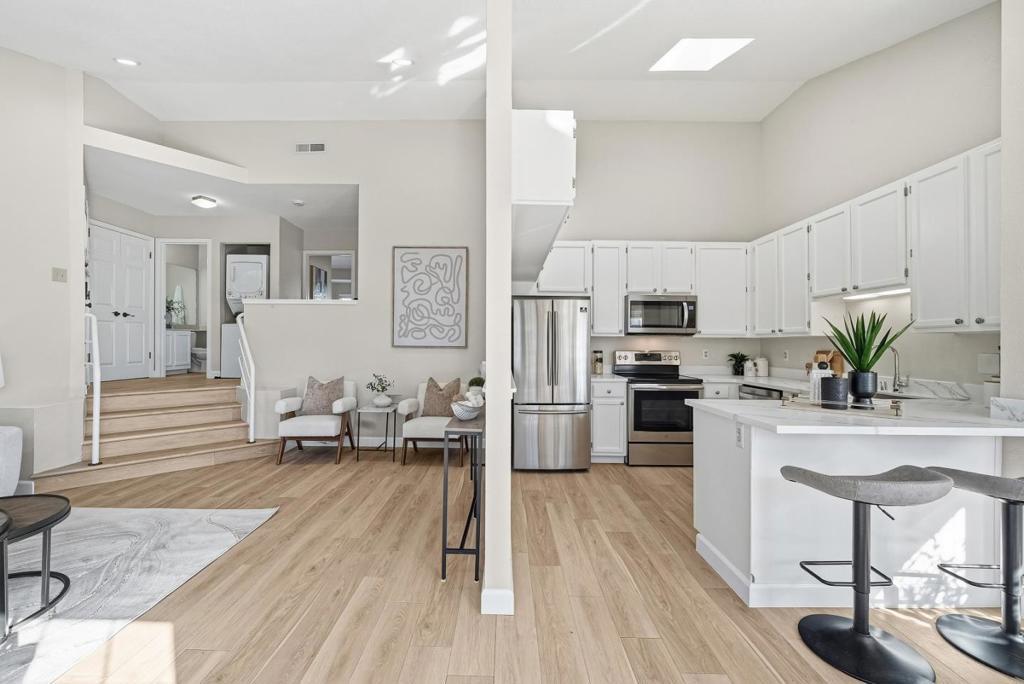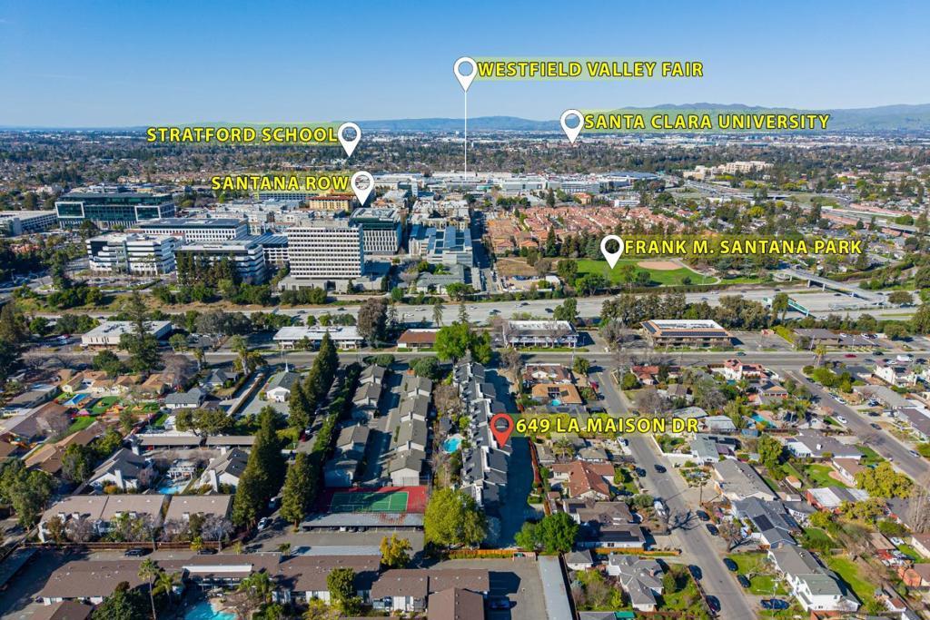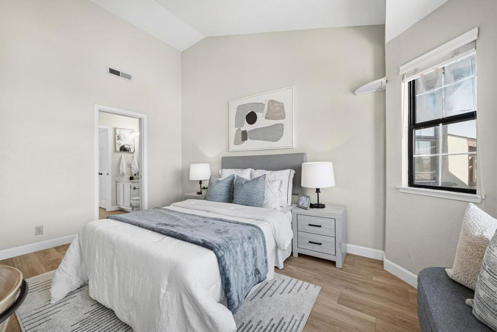 Welcome to this charming home located in San Jose, offering a comfortable living space of 1104 sq ft. This residence features two spacious bedrooms, including a primary suite/retreat, and two full bathrooms equipped with shower over tub, double sinks, and stall shower. The kitchen is well-appointed, boasting modern appliances such as a dishwasher, microwave, oven range - electric, and refrigerator, all complemented by a skylight for natural illumination. Notable amenities include vaulted and high ceilings, further enhanced by skylights, contributing to an airy atmosphere. The flooring throughout the home are hard flooring. Cozy up on cooler evenings with the gas fireplace. Central AC and forced air heating ensure comfort year-round. Laundry is conveniently located inside, equipped with washer and dryer. The property also features a fenced in-ground pool and community facility pool. The house is situated within the Campbell Union Elementary School District.