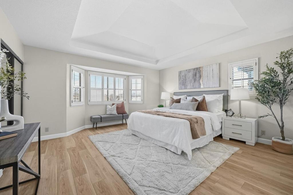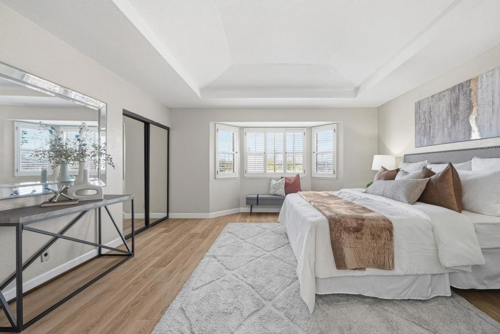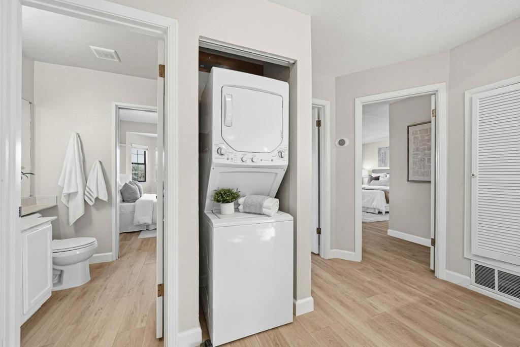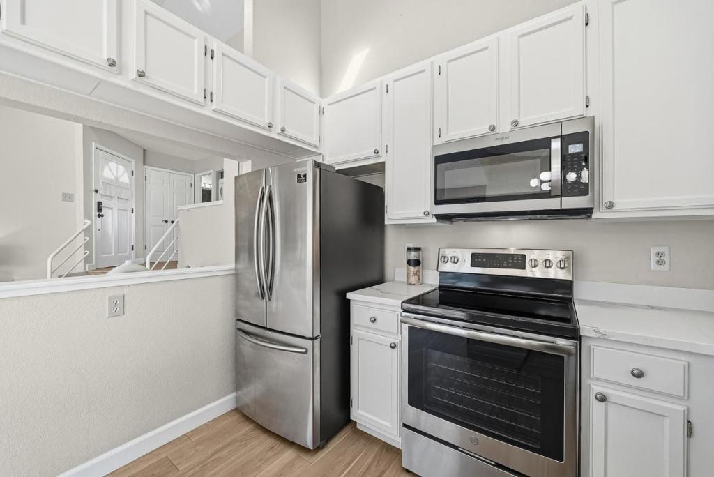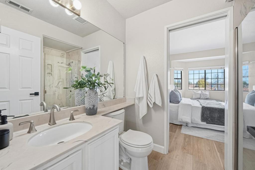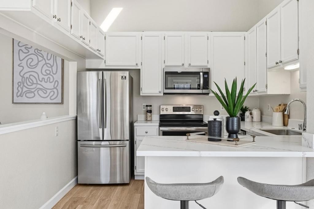 Welcome to this charming home located in San Jose, offering a comfortable living space of 1104 sq ft. This residence features two spacious bedrooms, including a primary suite/retreat, and two full bathrooms equipped with shower over tub, double sinks, and stall shower. The kitchen is well-appointed, boasting modern appliances such as a dishwasher, microwave, oven range - electric, and refrigerator, all complemented by a skylight for natural illumination. Notable amenities include vaulted and high ceilings, further enhanced by skylights, contributing to an airy atmosphere. The flooring throughout the home are hard flooring. Cozy up on cooler evenings with the gas fireplace. Central AC and forced air heating ensure comfort year-round. Laundry is conveniently located inside, equipped with washer and dryer. The property also features a fenced in-ground pool and community facility pool. The house is situated within the Campbell Union Elementary School District.