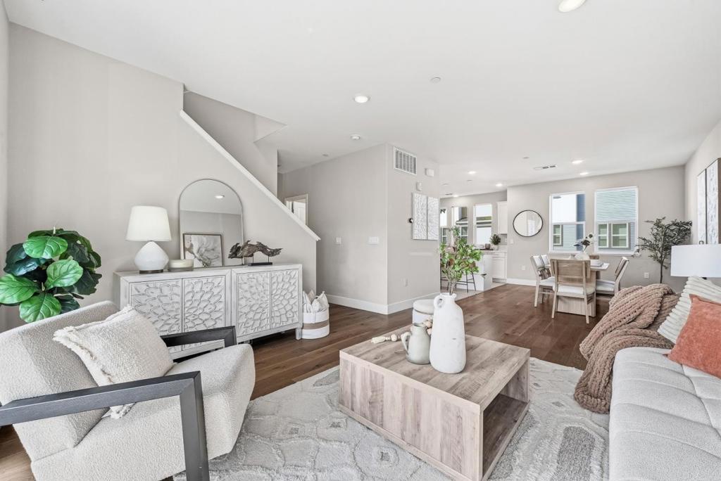 Welcome to this charming 2018-built home featuring two suites in the sought-after The Vale community of Sunnyvale. The entry level offers a welcoming foyer with a closet and direct access to the attached garage. The second level showcases a bright, open floor plan filled with natural light. The living room includes a sliding door to a private balcony and flows seamlessly into the dining area. The gourmet kitchen features a center island with breakfast bar, beautiful countertops and backsplash, modern appliances, and ample white cabinetry. A nearby half bathroom adds convenience. On the third level, the primary suite is located at the front of the home and offers a spacious bedroom with large windows. The en-suite bathroom includes a double vanity sink, large mirror, stall shower, and walk-in closet. A second suite sits across the hallway and features a bathroom with a shower over tub. Enjoy a prime location close to restaurants and grocery stores including Costco, Whole Foods, and Target. Near major tech companies such as Google, Microsoft, Apple, and Amazon, with easy access to Highway 101, Central Expressway, and Lawrence Expressway. Do not miss this great opportunity!