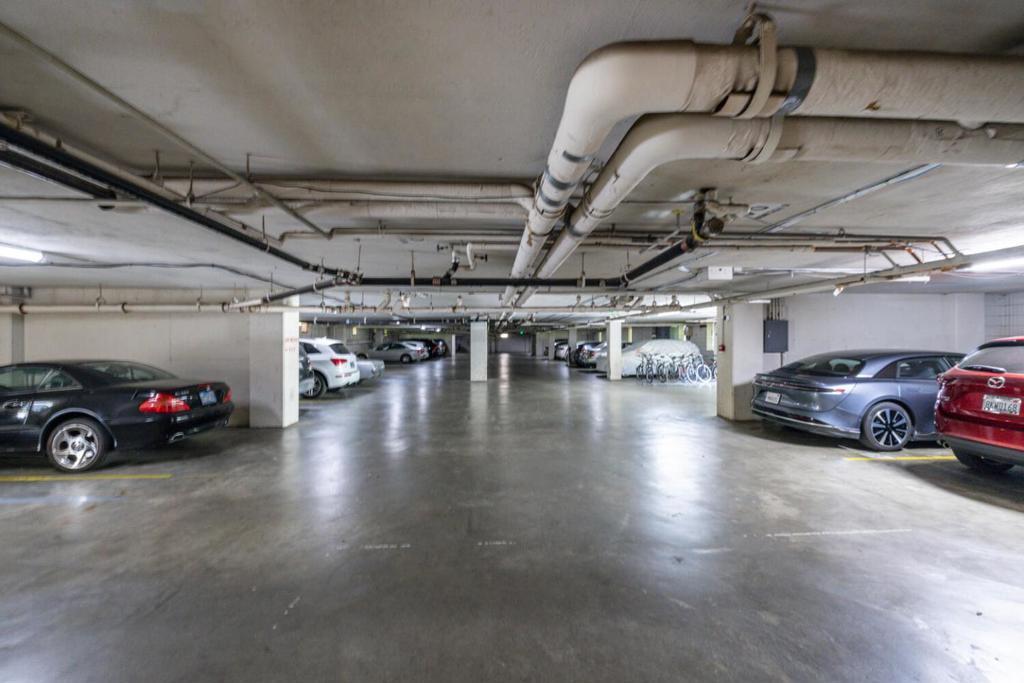This beautifully upgraded 1 bed / 1 bath home offers modern comfort, refined style, and turnkey convenience. A welcoming entry with designer lighting and new porcelain tile flooring leads into the remodeled kitchen featuring new cabinetry, stone countertops, updated plumbing, a stainless steel LG refrigerator, and a stacked ventless LG washer/dryer. A new 100-amp electrical panel and fresh paint enhance the light-filled open living and dining layout. Floor-to-ceiling south-facing windows open to an expansive 194 sq ft balcony overlooking the pool deck, lush greenery, and a walking path, providing rare privacy with no rear neighbors. With the pool unheated from Labor Day through Memorial Day, the setting remains quiet and serene most of the year. The spacious bedroom includes new mirrored closet doors, while the refreshed bathroom features updated plumbing and a rebuilt shower valve. Community amenities include secured entry, covered parking, two pools, two spas, a fitness center, and a Bay-view community room. Move-in ready and thoughtfully updated, this home combines comfort, light, and tranquility.