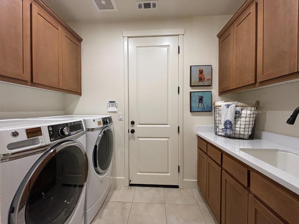Model Home for Sale! This beautifully home is situated on an expansive corner lot and offers a warm, welcoming layout designed for both connection and comfort. Thoughtfully planned, the private primary suite is tucked away from the guest bedrooms, creating a peaceful retreat while the open great room serves as the heart of the home perfect for gathering with family and friends. The spacious great room flows seamlessly into kitchen. Extended cabinetry, and generous counter space provides exceptional storage and functionality, making everyday living and entertaining effortless. The serene primary suite features dual vanities, a soaking tub, and a separate shower offering a spa-like experience at home. Both bathrooms are beautifully finished with elegant Piedrafina vanities for a cohesive, elevated feel. Additional upgrades enhance the homes charm and convenience, including hardwood flooring throughout the main living areas, crown molding, recessed lighting, a finished two-car garage with textured and painted walls. Modern comforts such as a Smart Thermostat, Ring doorbell, alarm system, and included appliances make everyday living easy. Drought-tolerant landscaping in both the front and backyard provides attractive, low-maintenance outdoor spaces to relax and enjoy.