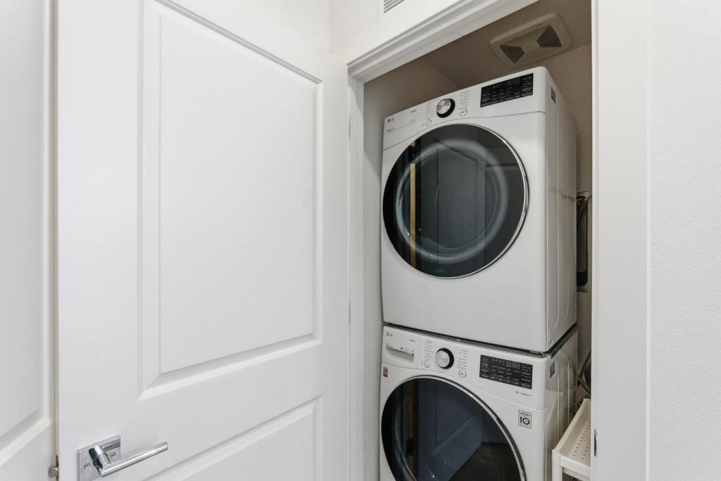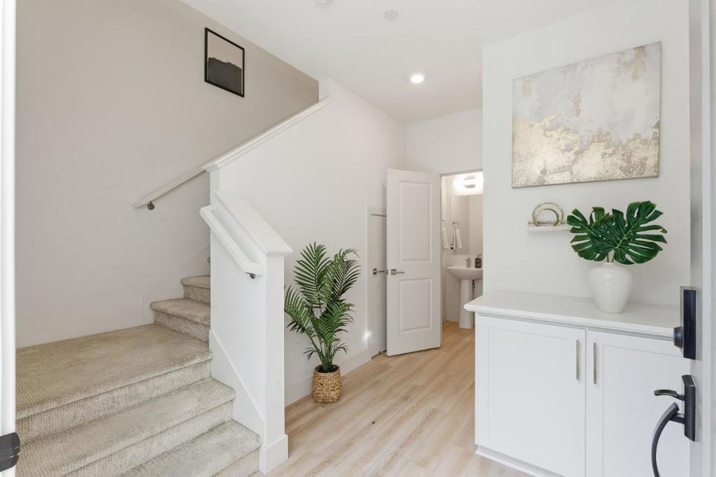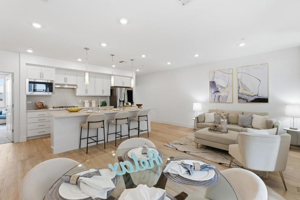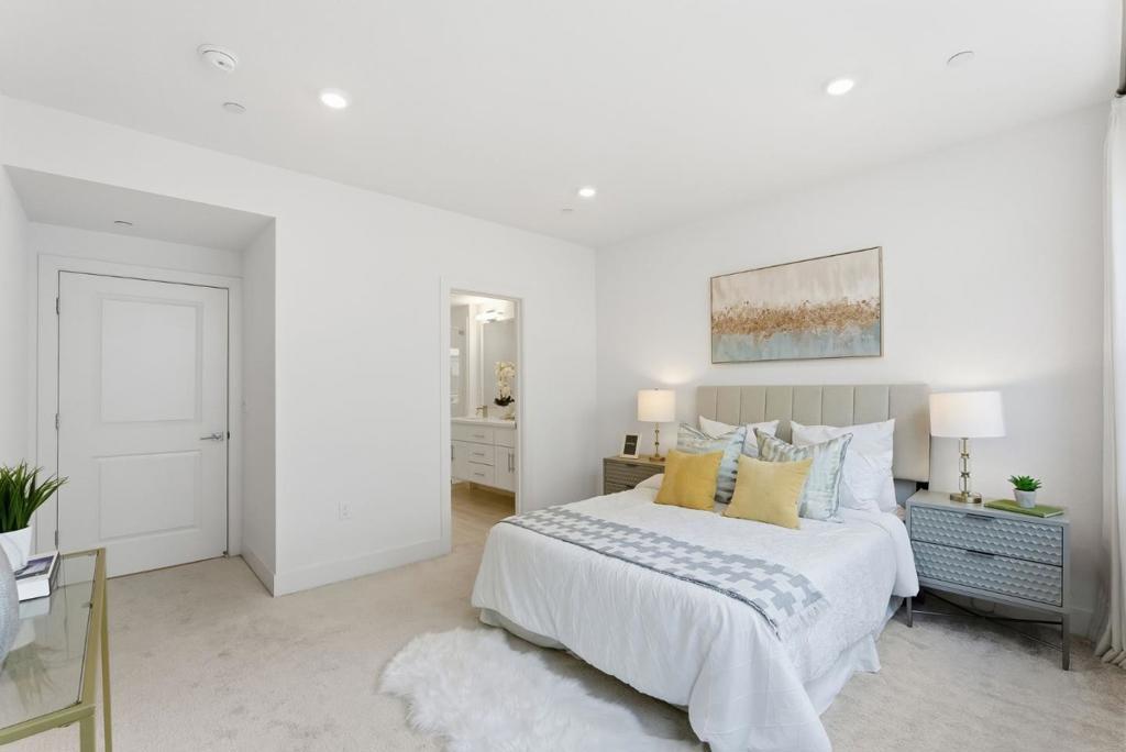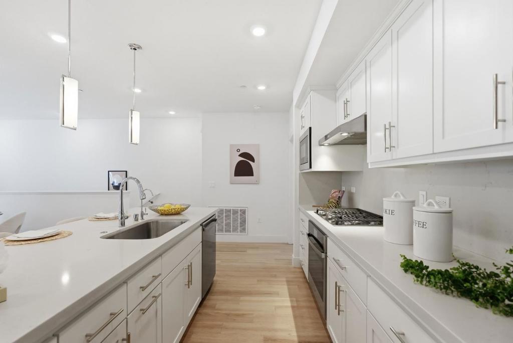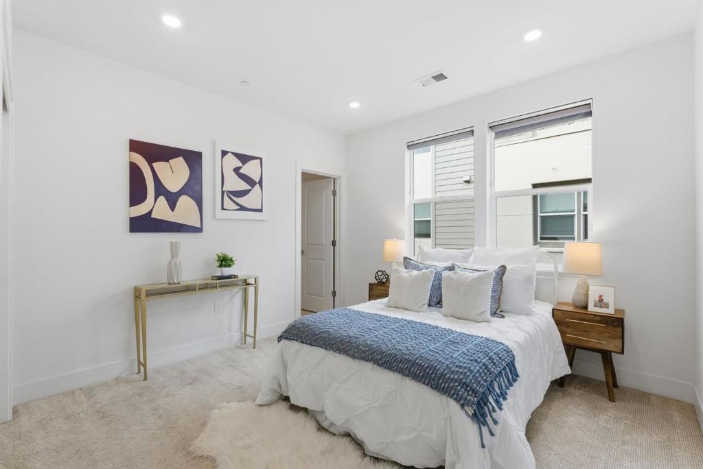 Beautifully upgraded modern home in the highly sought-after Nuevo community by award-winning Summerhill Homes with East-facing door. This light-filled residence features an open layout with high ceilings and hardwood floors connecting the spacious living and dining areas, plus a private balcony for easy indoor-outdoor living. The chef's kitchen offers quartz slab countertops, soft-close cabinetry, and stainless-steel appliances with ample counter space. Dual primary suites with en-suite baths provide flexible, private living options. Additional highlights include low Santa Clara utilities, efficient HVAC, a tankless water heater, a fully equipped 2-car garage fitness area, and a water softener. Enjoy community amenities including basketball courts, playground, herb garden, dog park, and bike station. Prime location near Nvidia and Apple, walking distance to Costco and Caltrain, with easy access to Downtown Sunnyvale, Santa Clara Square, Whole Foods, and major expressways.