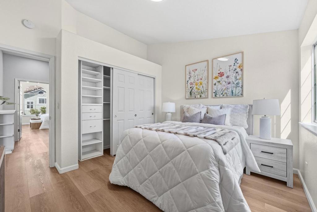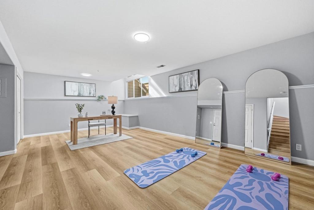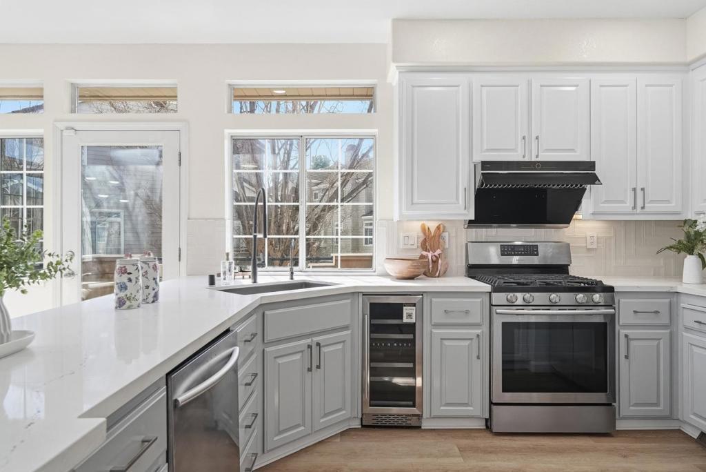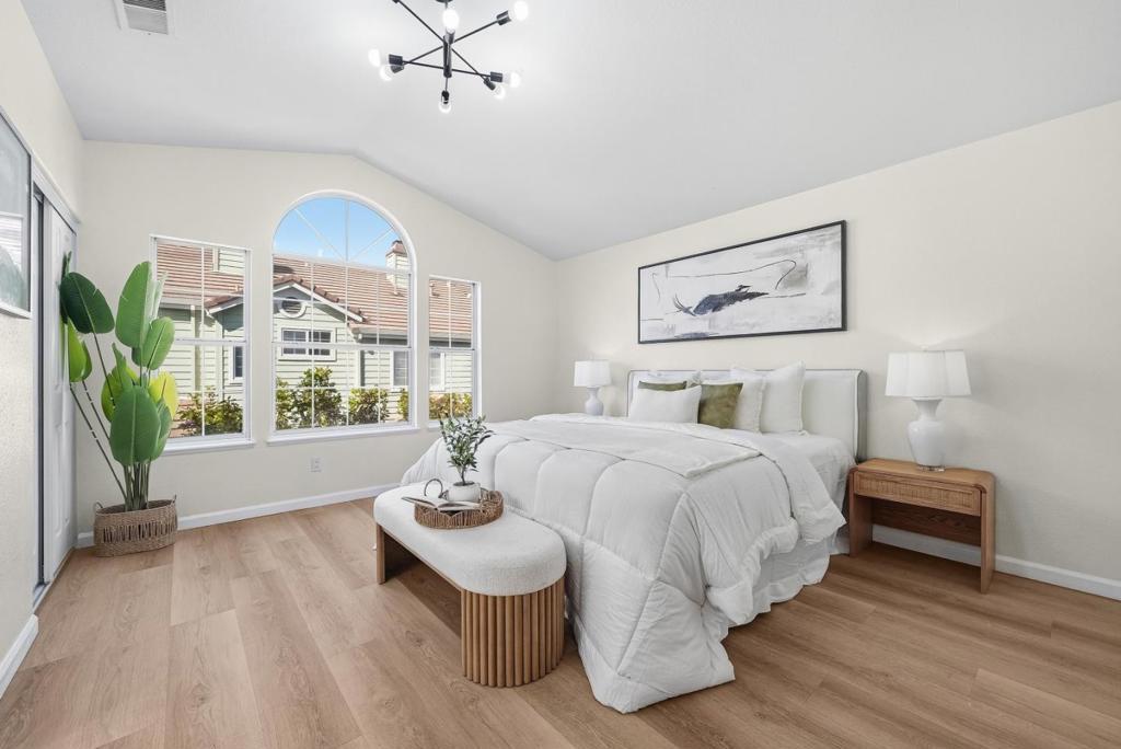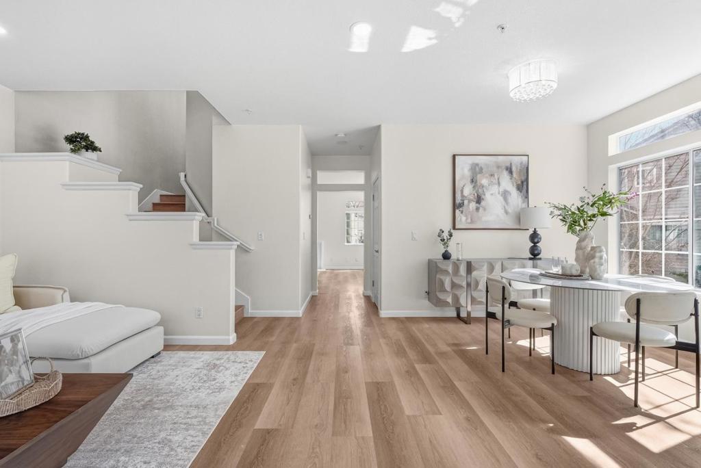This spacious 3 bed, 2.5 bath end-unit townhome sits in a secluded cul-de-sac and lives like a single-family home. One of the most serene communities in Tasman Crossing, Traditions is surrounded by towering redwoods and lush greenery. The interior features fresh paint, new light fixtures, recessed lighting, hardwood floors, plush new carpet, and abundant natural light through large windows and sliding doors. The open living and dining area flows into a family room off the kitchen with a cozy fireplace. The gourmet eat-in kitchen offers stainless steel appliances and a breakfast bar. The oversized primary suite features a walk-in closet with custom shelving and an updated primary bath with modern finishes, including tub and separate shower. Spacious second and third bedrooms offer large closets, and a bonus room exclusive to Traditions is perfect for guests or a home office. Additional highlights include an attached two-car garage with Tesla charger, two private balconies, and a smart home system with smart lock, thermostat, EV charging, and Tesla-integrated garage door. HOA includes pool, spa, water, garbage, and earthquake insurance. Conveniently located near Seven Seas Park, VTA, grocery stores, major tech companies, and Highways 101, 237, and 85.