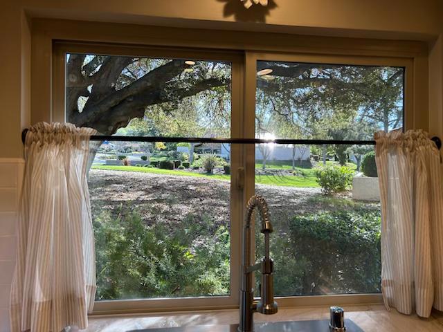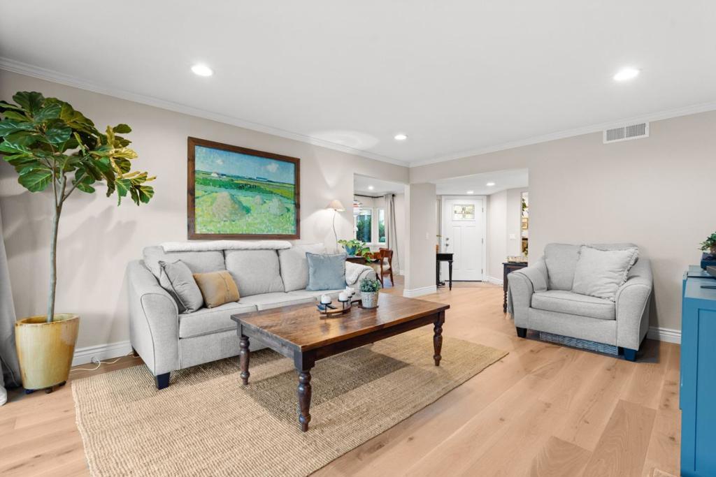 Stunning home, fully remodeled with the highest quality materials and designs. Lovely front patio with a view of the Majestic Oak tree and a view of the 15th hole from your covered back patio. This wonderful end unit features two bedrooms plus a den. The kitchen features high end custom cabinetry, new Quartzite countertops, custom backsplash, stainless appliances, instant hot water heater and a breakfast nook. New beautiful wide plank engineered Euro Oak hardwood flooring. Large primary bedroom and bathroom with a walk-in closet. Remodeled bathrooms with custom wainscoting. Separate laundry room with cabinetry and granite counters. Recently painted interiors with designer paint colors. Updated Raised Panel interior/exterior doors. Updated baseboards and crown molding. Recessed lighting with dimmers and under counter lights. Electric fireplace with fan and remote. Updated dual paned windows and sliding doors. One car attached garage with attic storage, and a one car detached carport. Stays cool and comfortable in the summer. All of this in the resort style living at The VILLAGES GOLF & COUNTRY CLUB, one of the only Guard Gated 55+ Communities in The Bay Area. Live in a resort like environment enjoying golf, tennis, pickle ball, pools, fitness center, clubs and much more
