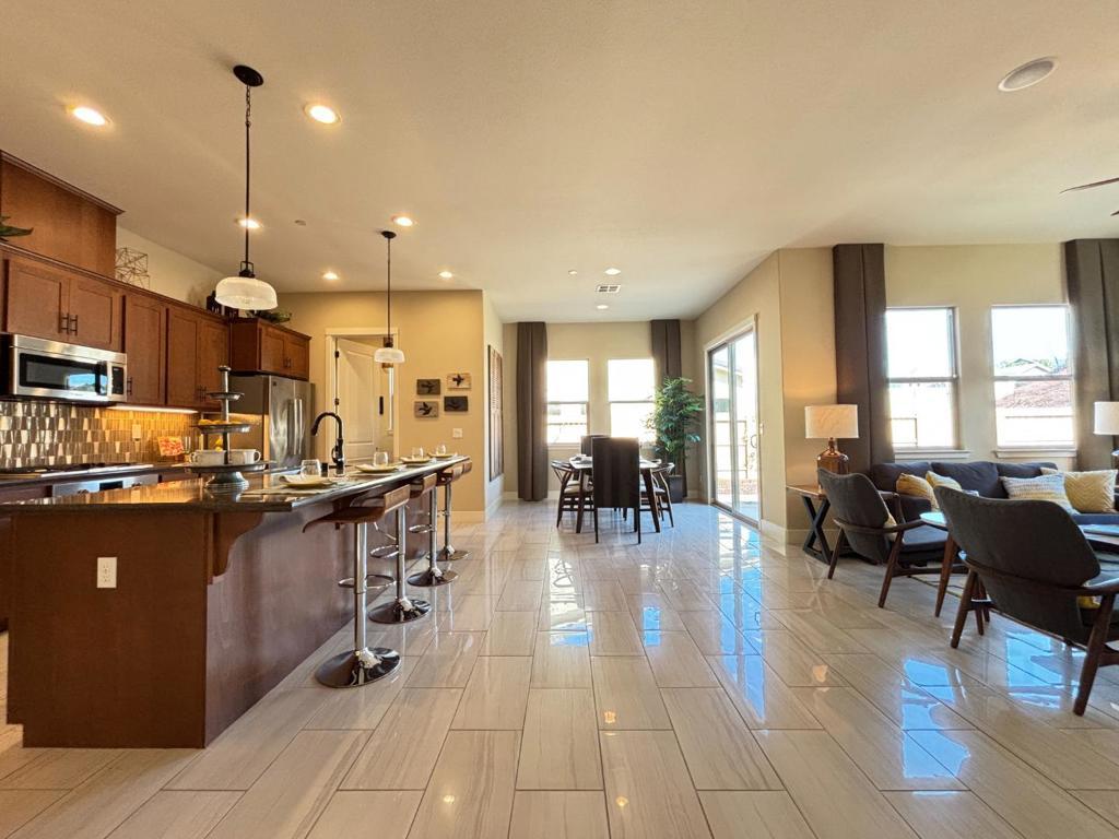 Model Home for Sale! Situated on a spacious lot with impressive three-car-wide driveway appeal. Beautifully designed for comfort and functionality. The center of the home, the gourmet kitchen shines with an oversized island, designer backsplash, and premium upgrades throughout. With its warm finishes and cozy ambiance, its perfectly suited for everyday living and entertaining alike. All appliances are included for added convenience. The serene primary suite offers a spa-inspired retreat with dual vanities, a soaking tub, and a separate shower. Both bathrooms showcase elegant marble vanities, creating a cohesive and elevated look throughout. Additional highlights include upgraded tile flooring in the main living areas, plush upgraded carpet in the bedrooms, and a charming rock fireplace that adds warmth and character. The finished three-car garage is textured and painted for a polished appearance. Enjoy outdoor living with drought-tolerant landscaping in both the front and backyard, providing beautiful, low-maintenance spaces to unwind and entertain. This former model home blends thoughtful design, cozy charm, and modern upgrades ready to welcome you home. Garage is presently being used as a sales office, and will be converted back into a functional garage prior to closing.
