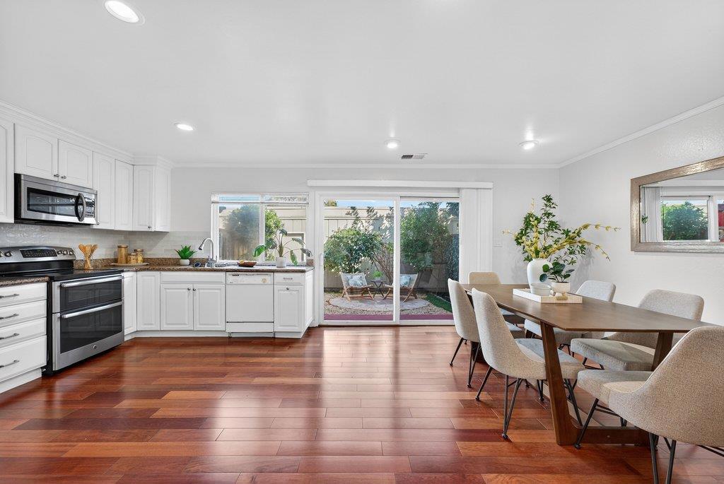 Welcome to this beautifully updated 3-bedroom, 2.5-bath townhouse in the desirable Tanglewood community of Blossom Valley. The spacious open-concept kitchen features stone countertops, a white subway-tile backsplash, a built-in electric range with double oven, and stainless steel appliances, seamlessly flowing into the bright living and dining areas. Rich hardwood flooring runs throughout the home, creating a warm and modern feel, and a convenient half bath is located on the main level. Upstairs, the primary suite offers a quiet, private balcony overlooking the greenbelt, a beautifully remodeled shower, and a wall-to-wall closet, providing a comfortable retreat. Two quiet, spacious bedrooms with mountain views. Central A/C, dual-pane windows, recessed lighting, in-unit laundry, copper plumbing, New roof shingles, and ample storage, along with a spacious, inviting private patio. Owners enjoy a park-like community setting with tree-lined paths, a pool, a clubhouse, a kitchen, ping-pong, and a BBQ area. HOA Inc. water and trash. Conveniently located just 0.2 miles from Branham Light Rail with easy access to Hwy 85, 87, and Almaden Expy, Minutes from Costco, Trader Joes, dining, and entertainment at Westfield Oakridge Mall. Move-in ready, Excellent location! Nice neighbors!