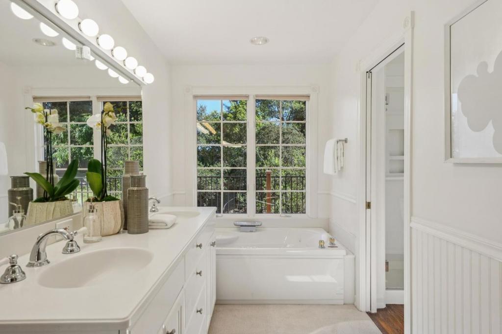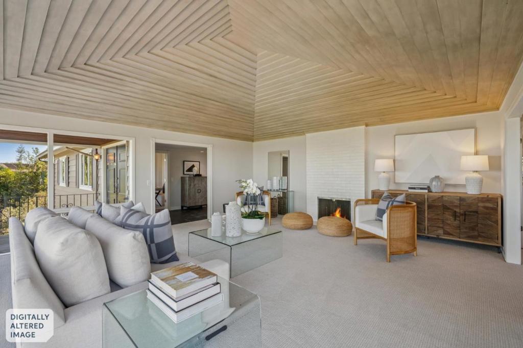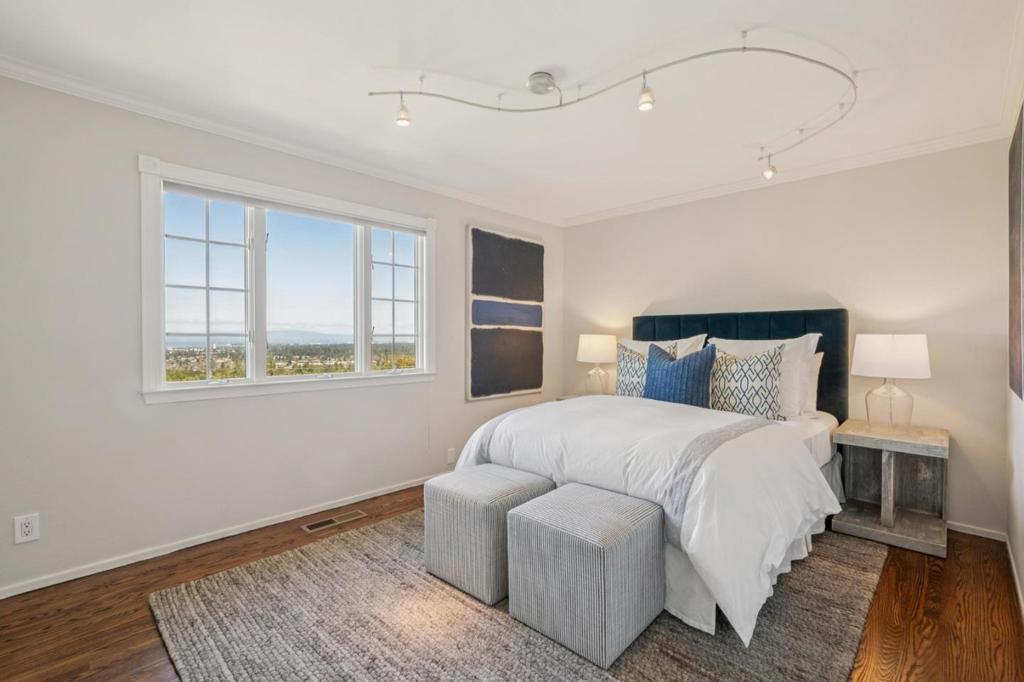 Significant Mid-Century Modern Architecture with Bay Views. Sweeping San Francisco Bay views take center stage at this exceptional Woodside Hills property with fresh updates throughout. Spanning one acre, the elevated corner lot is positioned to capture the expansive views while also providing generous level areas for outdoor living. Enhancing the setting is the gentle sound of a meandering creek and strolling paths that create a distinctly parklike ambiance. Fresh interior updates include new paint, refinished hardwood floors, and new carpet, all complementing the living rooms signature vaulted ceiling, handcrafted with layered redwood cedar rising to a dramatic center peak. Multiple fireplaces add warmth and character, while glass doors open to several outdoor spaces oriented to enjoy the Bay views. The formal living room and dining room each have Bay views, plus there is a large open kitchen and family room for everyday gatherings. Four bedrooms, an office, and 3.5 baths are well arranged, featuring a main-level primary suite and a second suite comprising the entire lower-level with outside access and flexibility for future ADU conversion. An attached two-car garage and abundant off-street parking complete this inviting retreat with close-in convenience.