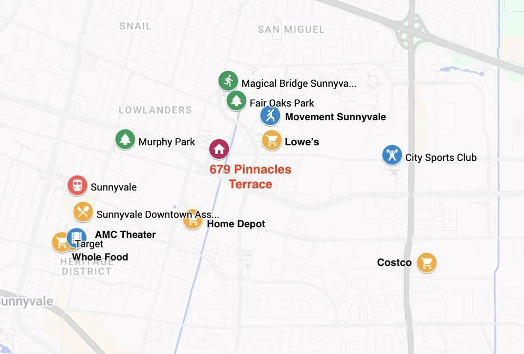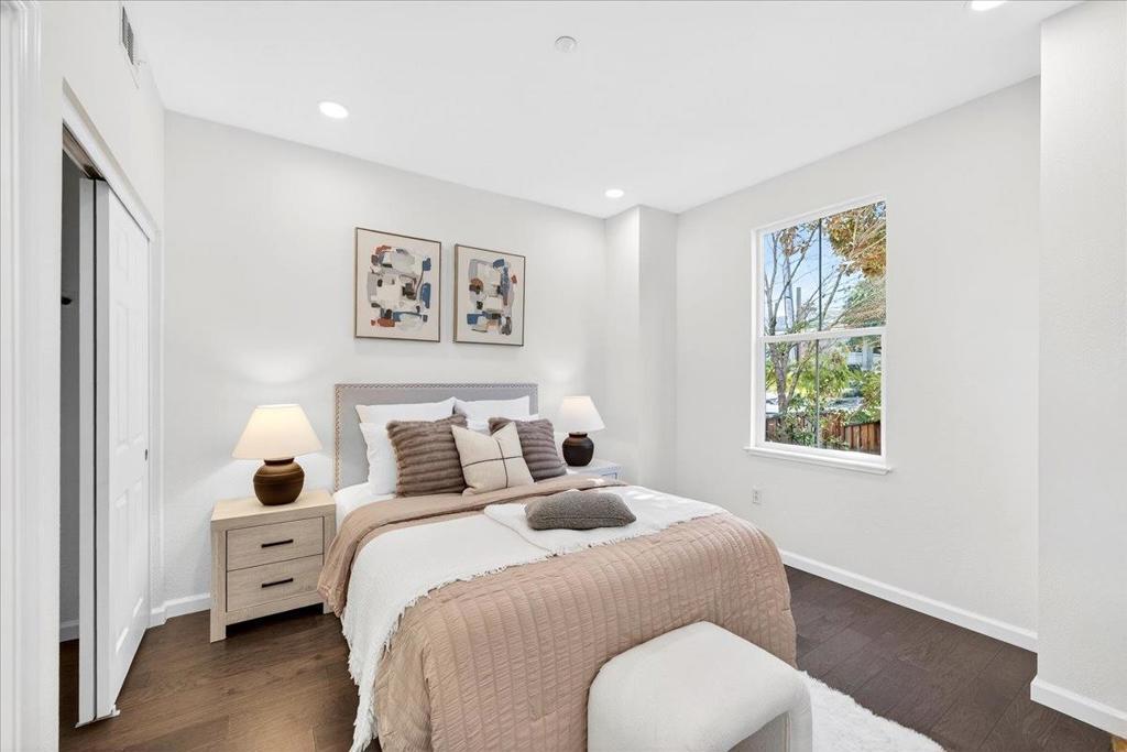 Stunning Renovated Sunnyvale PUD Townhome with Ultra-Low $90 HOA First Time on the Market! Bright and modern, this move-in-ready home offers exceptional versatility with a bedroom and full bathroom on every level, including a ground-floor suite. Soaring ceilings and an open design showcase fresh designer paint, elegant wood flooring, brand-new tile, and plush new carpet. The modernized kitchen and bathrooms shine with chic white cabinetry, sleek quartz countertops, and contemporary LED lighting. The top-floor primary suite features a spacious walk-in closet and a refreshed dual-sink vanity bath. High-value upgrades include brand-new dual-zone A/C units, upgraded dual-pane window glass for energy efficiency and sound insulation, and inside laundry with a new washer and dryer. Enjoy a private fenced front yard with a lush new lawn and professional landscaping, plus a convenient two-car side-by-side garage. Centrally located just minutes from major tech campuses like Apple, Google, Meta, and LinkedIn, Caltrain, shuttle stop, local parks, Magical Bridge playground and the vibrant dining and shopping of Downtown Sunnyvale. Modern style, incredible value, and unbeatable Silicon Valley convenience - a rare find!