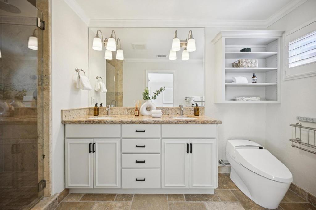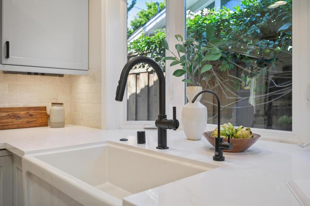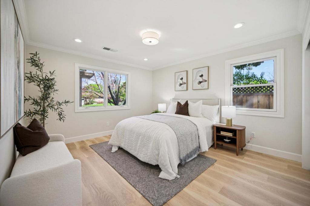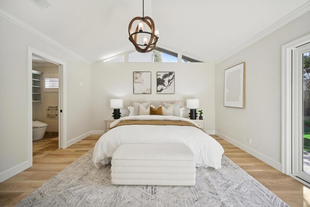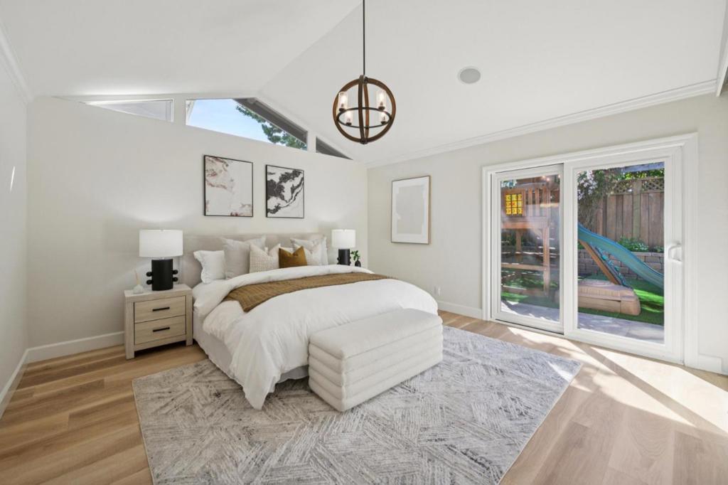 Striking single-level home thoughtfully remodeled and expanded (effective year built 2008), blending elegant design with modern comfort. Upgraded in 2023 with a new roof, 20 solar panels, and Tesla Powerwall, providing enhanced energy efficiency. Ideally situated on a quiet street in sought-after Old Orchard near Las Palmas Park. Close to top-rated public schools, Sunnyvale Library, Downtown Sunnyvale, Community Center and major employers. Dramatic foyer with soaring ceilings, custom chandelier, and stone medallion floor greet you as you enter. Elegant millwork and refined architectural details throughout. Refreshed kitchen with new quartz countertops, large bay window, mosaic tile backsplash, and premium appliances (Sub-Zero refrigerator, Thermador stovetop, and Miele oven & dishwasher). Bright living room showcases vaulted ceilings, expansive windows and cozy fireplace. Open-concept layout flows seamlessly into dining area, fills home with natural light while offering views of professionally landscaped backyard. Stone pavers and fireplace create an inviting setting for effortless indoor-outdoor living and entertaining. Spacious primary suite includes spa-inspired bath with natural stone tile and built-in bench, creating a relaxing private retreat. A perfect place to call home!