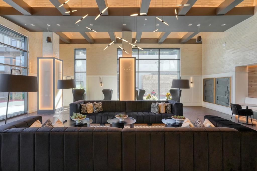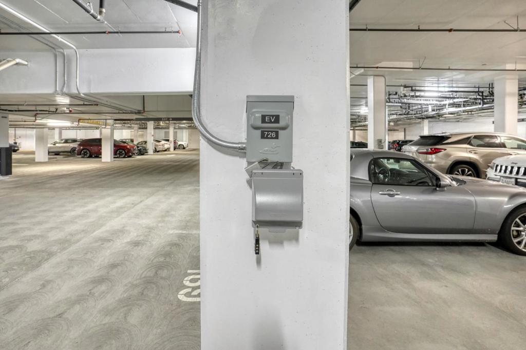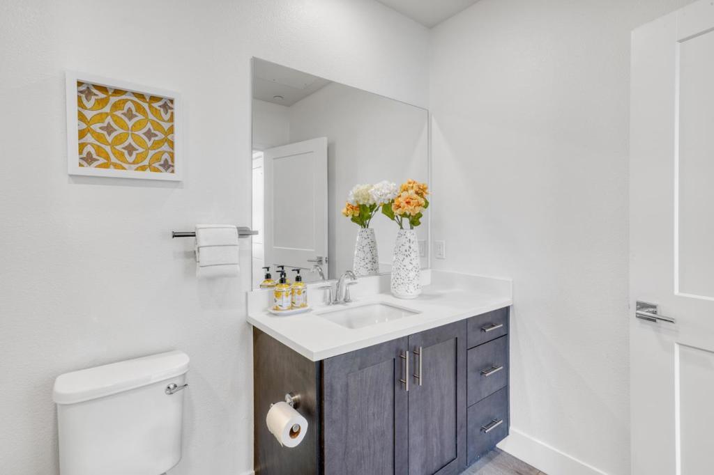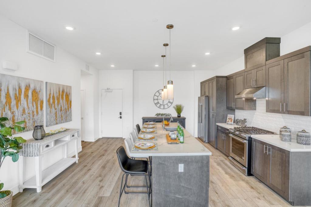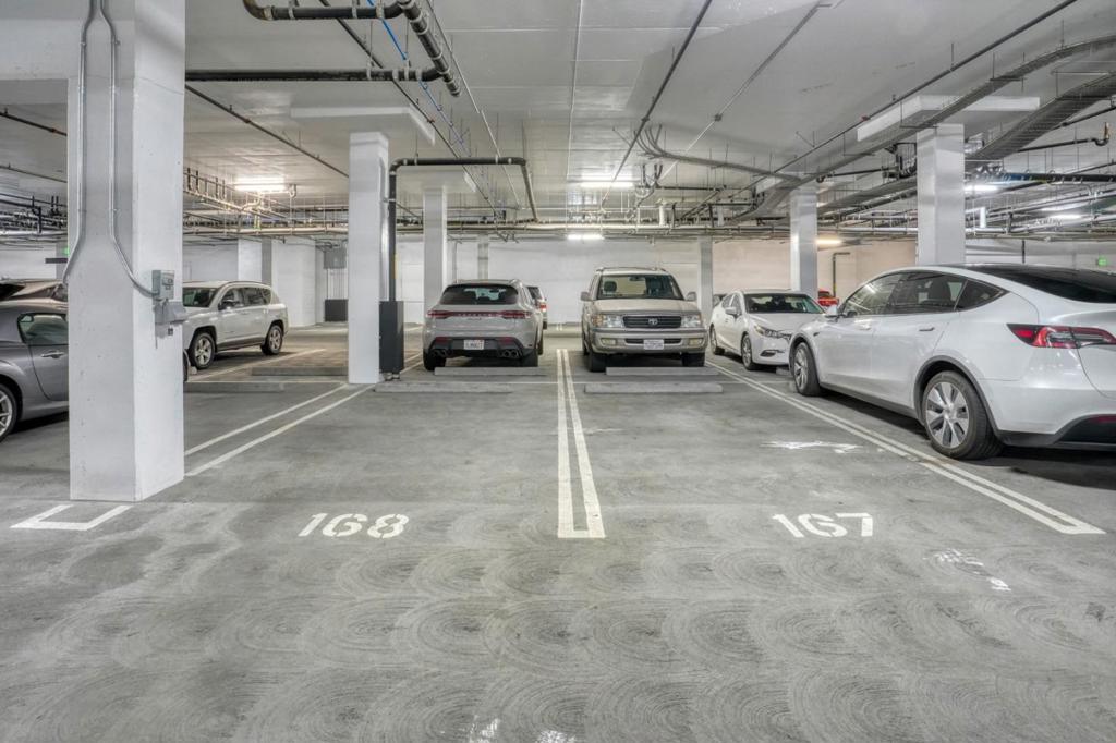 Top-level 7th-floor residence with rare 10-ft ceilings (only available on the top floor), creating an airy and sophisticated living environment. This luxury newer condo offers two spacious bedroom suites, each with its own bathroom and walk-in closet, providing privacy and comfort. The living room and both bedrooms face south, filling the home with abundant natural light throughout the day. Enjoy a private balcony overlooking the beautiful pool and distant mountain views. Residents have access to exceptional amenities, including a rooftop deck with luxury lounge spaces, resort-style pool, fitness center, pet grooming room, BBQ areas, and a stylish lobby perfect for welcoming guests. The unit includes two assigned parking spaces, one with a dedicated EV charging outlet. Ideally located in the heart of Silicon Valley, with convenient access to major highways and leading tech companies. A vibrant, modern community offering a young, active lifestyle with a refined luxury vibe.