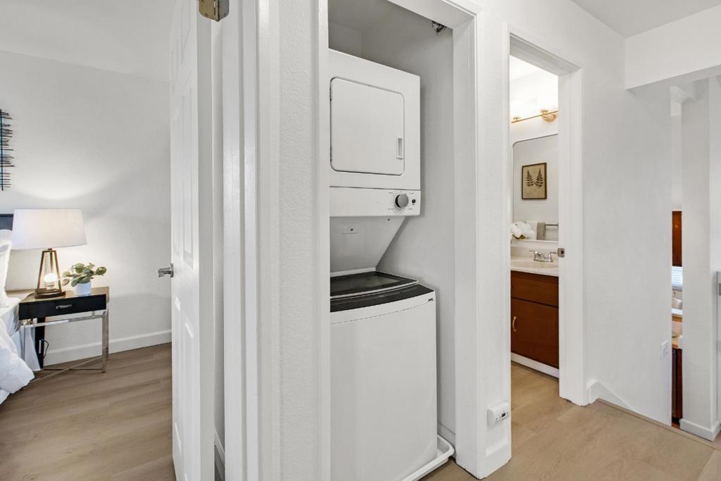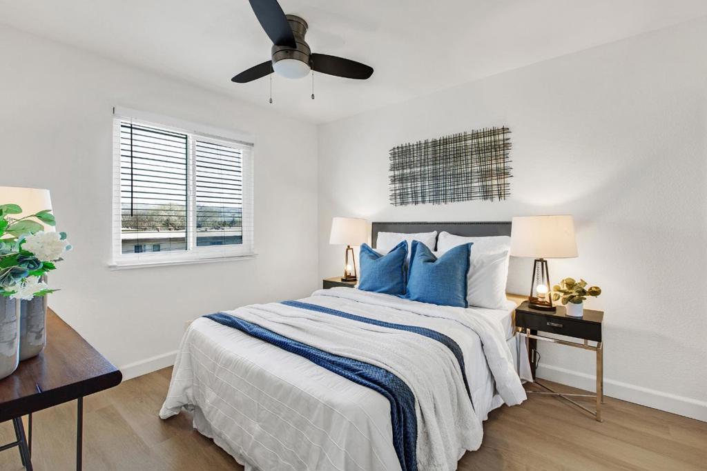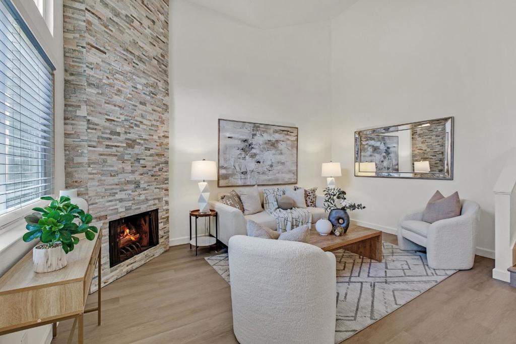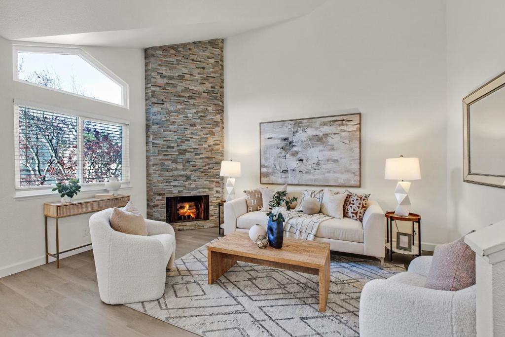 Exceptional 2-bedroom, 2-bathroom condominium in a premier complex location featuring fresh new vinyl flooring, paint, light fixtures, blinds, and dual-pane windows throughout. Top floor corner unit. Bedrooms offer mountain views, vaulted ceilings, ceiling fans, and abundant storage, complemented by in-unit laundry with washer and dryer included. The living room showcases an updated modern fireplace, while the kitchen provides ample cabinets, a new range, and generous counter space all supported by a new wall heater and water heater for optimal efficiency. Ideal parking includes 1-car garage parking plus assigned carport, with community amenities featuring a pool, clubhouse, and beautifully maintained grounds. Conveniently located near Highways 101, 280, and 680 for seamless Bay Area access. Minutes away from SJSU, SJC airport, downtown San Jose.