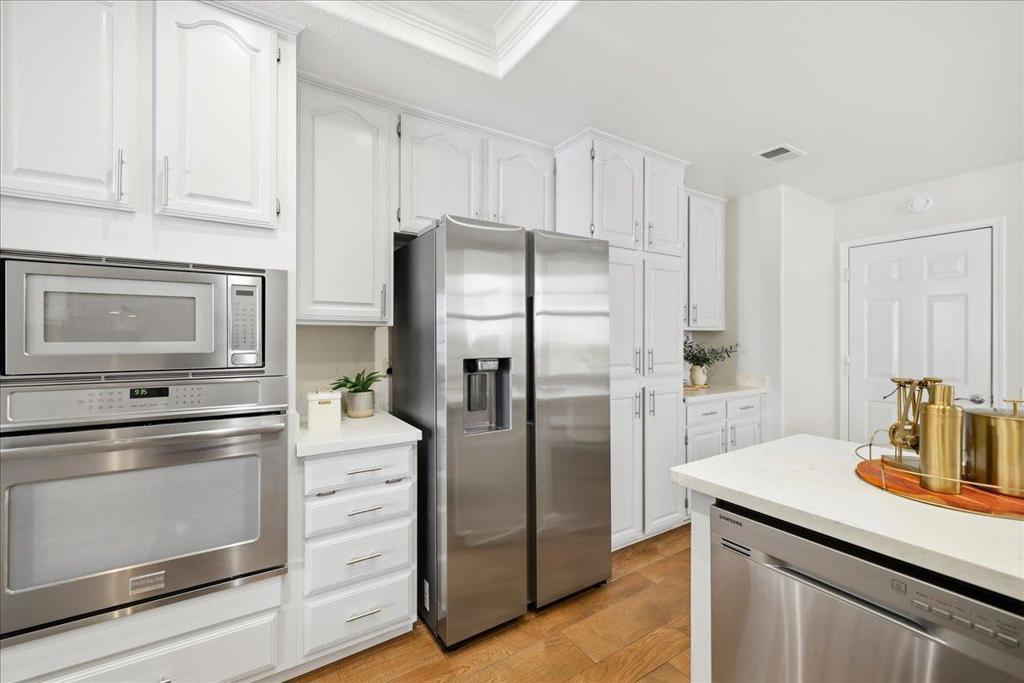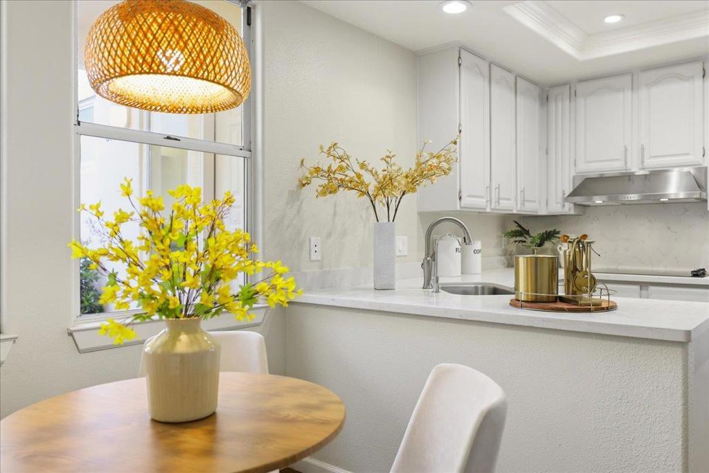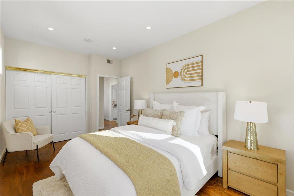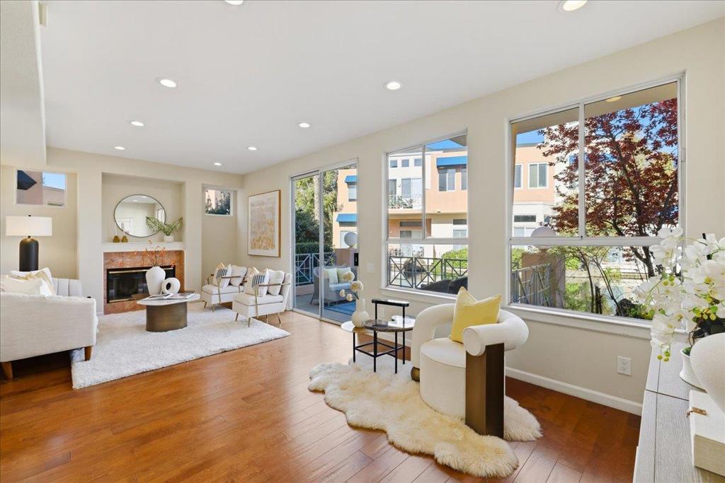 Beautifully situated in the desirable Lakeshore community of Redwood Shores, this bright and spacious corner-unit townhome offers approximately 1,996 sq ft of comfortable living space with 3 bedrooms and 2.5 bathrooms. The inviting living room opens to a private patio overlooking a tranquil waterway, creating a peaceful setting for relaxing or entertaining. The well-appointed kitchen features quartz countertops, stainless steel appliances, recessed lighting, and a charming breakfast area. Dramatic high ceilings and a striking spiral staircase enhance the homes open and airy feel while allowing abundant natural light throughout. Upstairs, the generous primary suite offers a walk-in closet and an updated bathroom with a frameless glass shower and soaking tub. Two additional bedrooms share access to a balcony, providing a pleasant outdoor retreat. Hardwood flooring throughout the whole property, in-unit laundry room, and attached two-car garage. Ideally located near scenic waterfront trails, parks, shopping, and major commute routes, and within a highly regarded school district. Enjoy the relaxed waterfront lifestyle that makes Redwood Shores one of the Peninsulas most desirable communities.