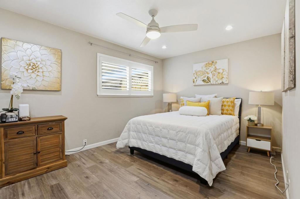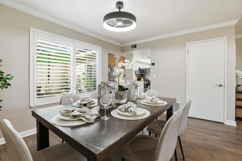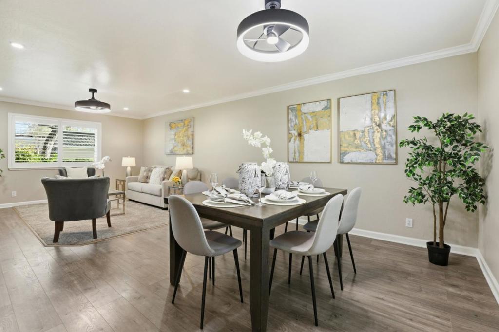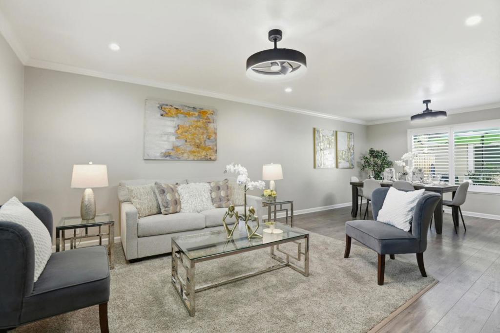 Rare single story end unit that lives like a single family home, situated in a quiet and well maintained community with beautifully manicured greenbelts and a friendly neighborhood atmosphere. The home features three generously sized bedrooms and two full bathrooms with a comfortable floor plan that includes new interior paint, crown molding, recessed lighting, and an enclosed laundry room. Additional updates include laminate flooring and refinished kitchen cabinets. Enjoy a private patio with a mature orange tree and remote controlled retractable awning, creating a relaxing outdoor space. The home is also conveniently located near the community pool and pool house. Additional highlights include an attached oversized two car garage plus an additional side parking space, offering room for a third vehicle along with generous storage. Next to Santa Teresa Golf Club and near the scenic trails of Santa Teresa County Park, offering easy access to golf, hiking, and outdoor recreation. Conveniently close to shopping, dining, and everyday essentials including Costco, with quick access to Highways 101, 85, and 87.