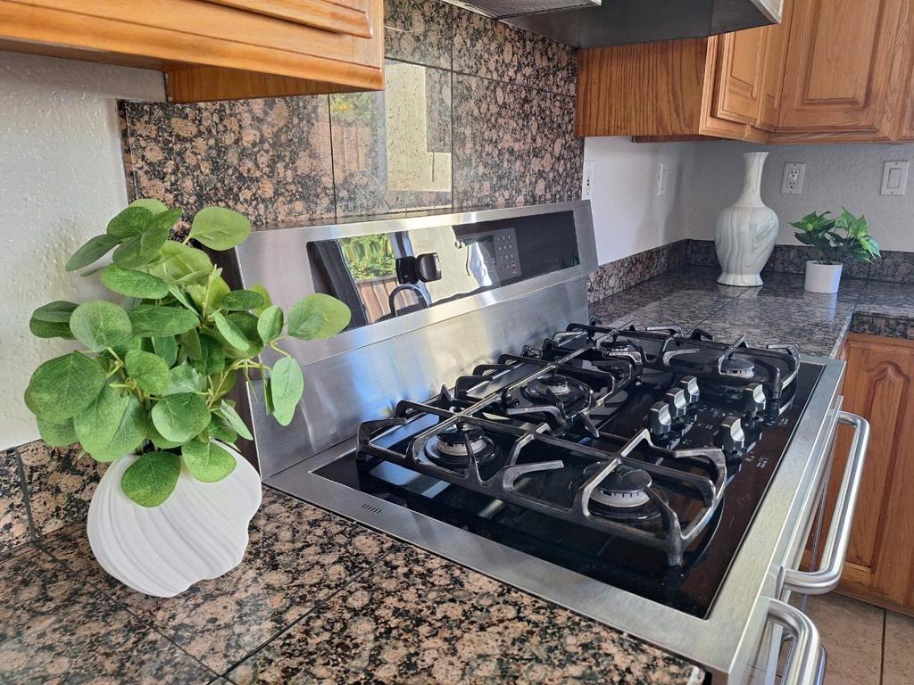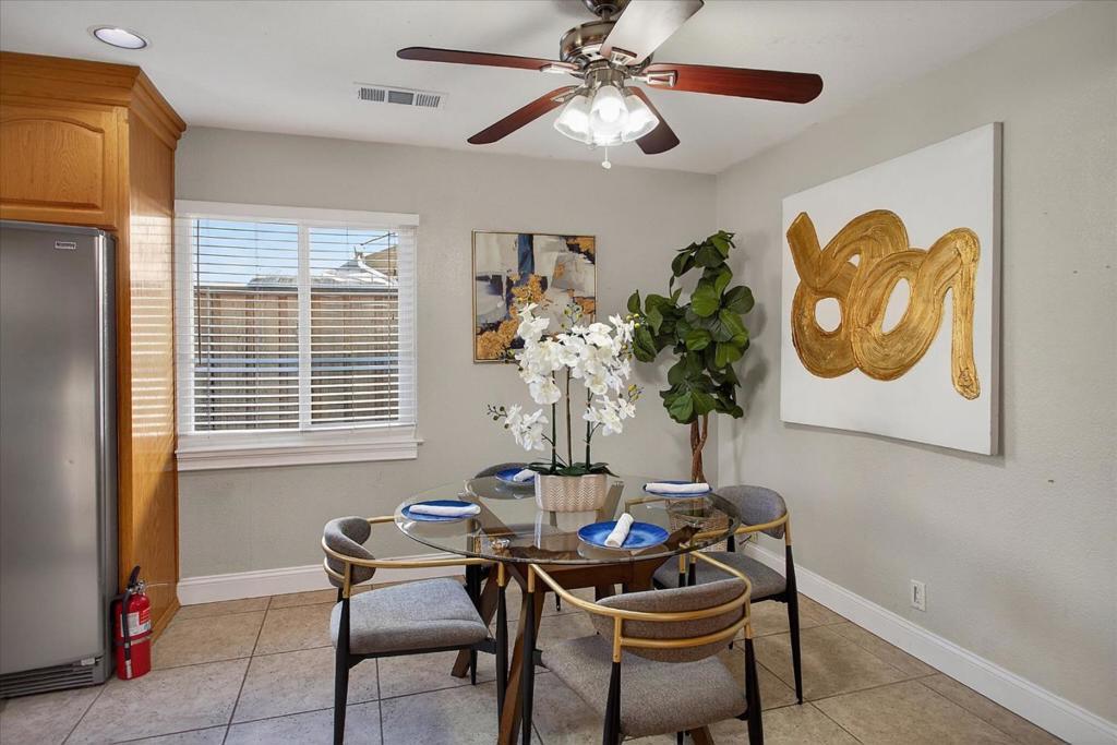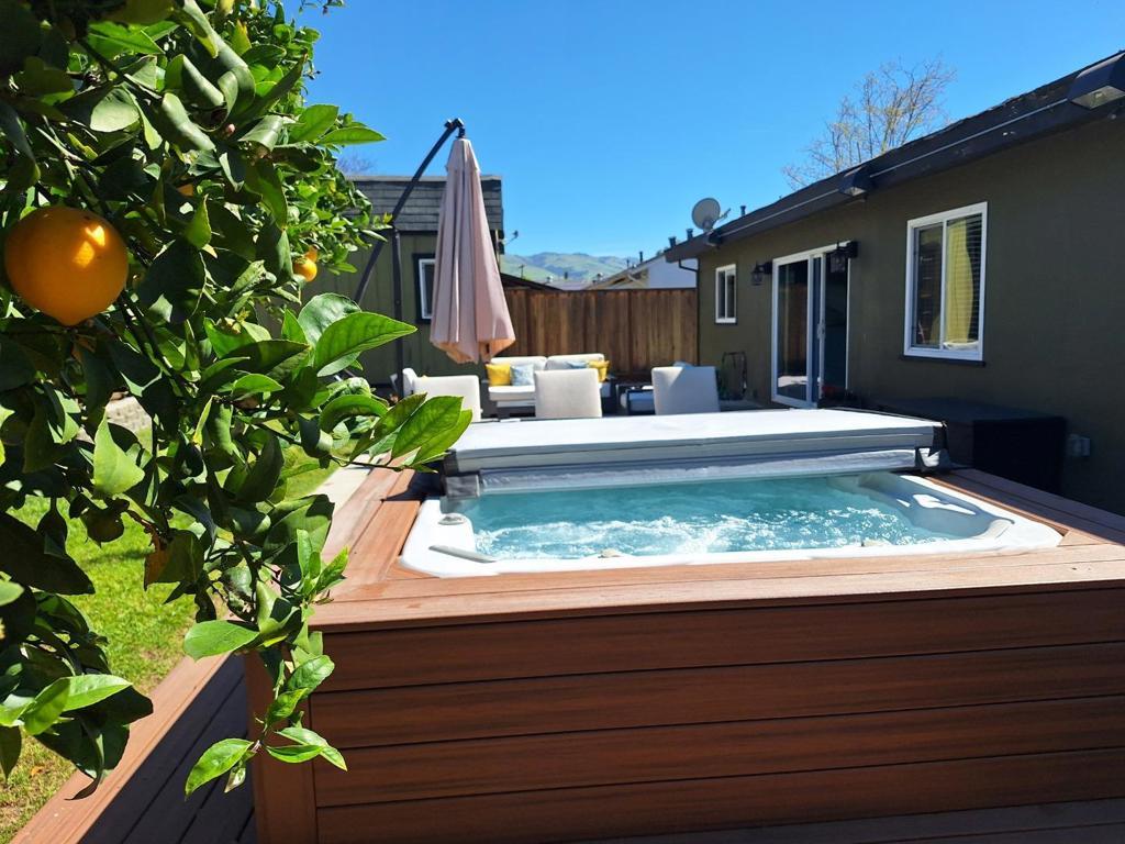 The spacious kitchen is a dream, boasting granite counters, stainless steel appliance, including an oversized Kenmore Elite 5-burner gas stove and oven and a Miele dishwasher less than a year old, and a breakfast nook with ample cabinetry.The updated bathroom features a granite counter vanity, and a shower-over-tub with tile surround. Open living and dining areas with backyard access. Prized upgrades include central air conditioning, large dual pane windows, hardwood floors, brand new hot water heater, fireplace in the living room, and ceiling fans in the bedrooms. Relax in the hot tub and enjoy the large backyard with mature landscaping. The finished shed with heating and cooling offers a wonderful, flexible-use space. Great house and yard for entertainment!One bedroom has been adapted into a deluxe closet and dressing room with built-in storage window seat, and an island-style dresser (not attached).Convenient location close to commute routes (including Lower Silver Creek Trail and VTA lightrail), shopping, and dining.Washer, dryer, and fridge included. Outside furniture may stay if desired (both front porch and backyard furniture).