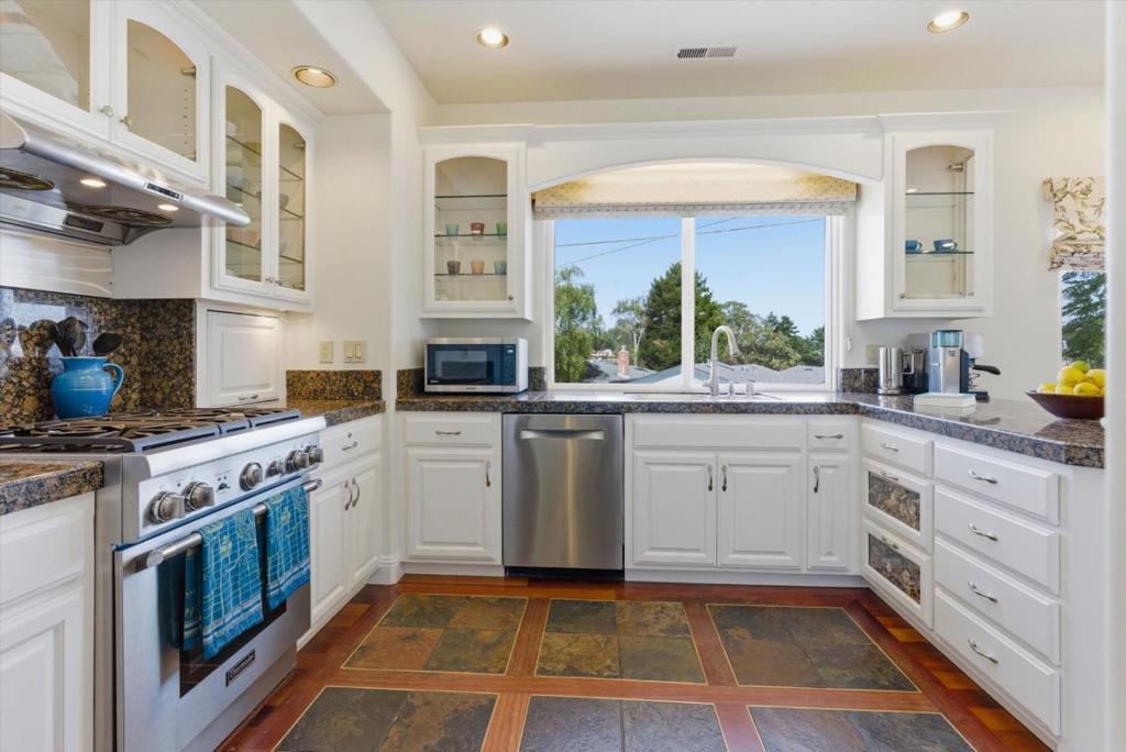 Exceptional Mediterranean Beauty. Attention to detail, design concept plus quality materials makes this a one-of-a kind home! Freshly painted interior, smooth finish walls, arched openings with bullnose corners. Abundant nat.light thru numerous dual paned & beveled glass windows + skylights. Well-appointed kitchen features gas range, stainless appliances, granite counters, appliance garages, pantry closet + inlaid slate floor. Rich Cherry, Birch & slate floors. Primary Suite complete w/high ceilings, granite surfaces @ dual sink vanity & jetted tub, sep. shower + laundry chute. Elegant open staircase. Ground floor offers 2 additional spacious bedrooms (Murphy bed included), full bath adjoining a bedroom & foyer with access to laundry/garage/yard. New glass patio door opens to covered porch/yard. Flagstone walkways lead to private oasis where you can relax or host your next party. Dine al fresco beneath the wisteria draped arbor & cafe lighting. Smart outdoor kitchen equipped w/gas BBQ + rotisserie, refrigerator, prep sink on granite counters + storage cabinets. Flowering plants, Meyers lemon, Bears lime, roses, bougainvillea, magnolia & birch trees on auto drip. Stamped concrete driveway, EV charger. Great Upper Westside: EZ access to UCSC, trails/beaches/surfing/dining + more!!!