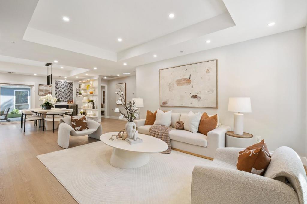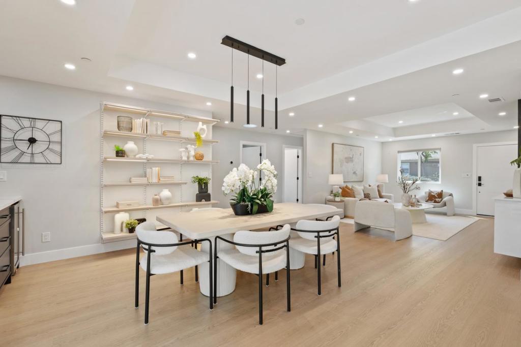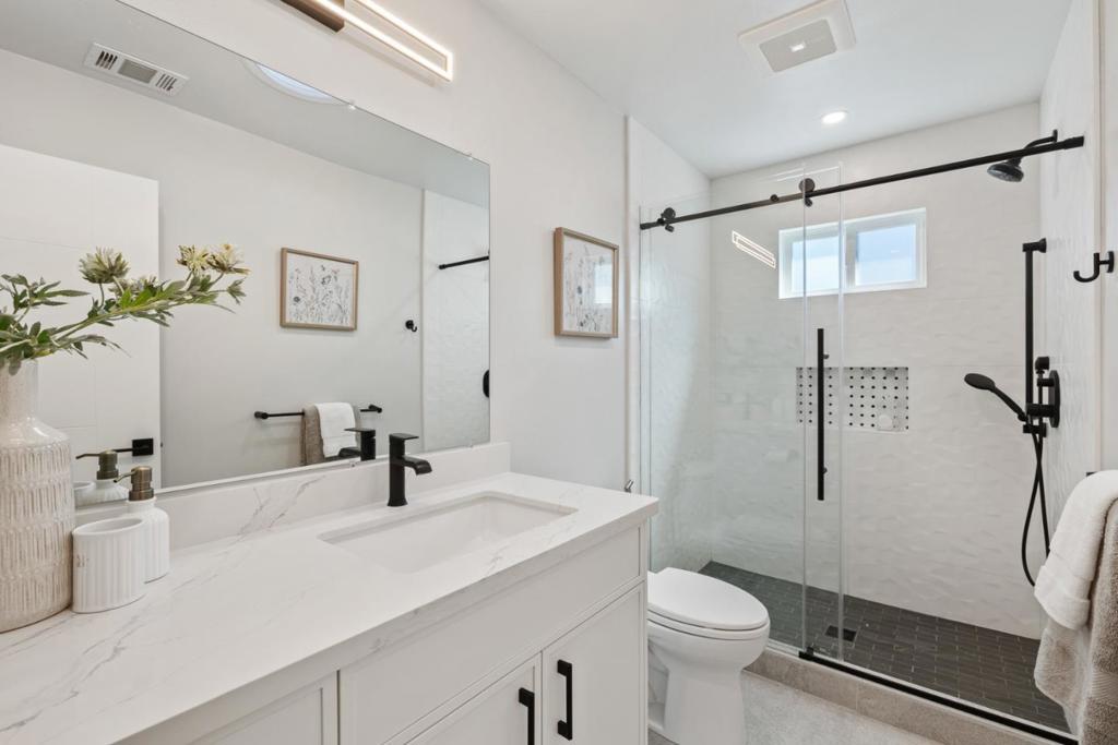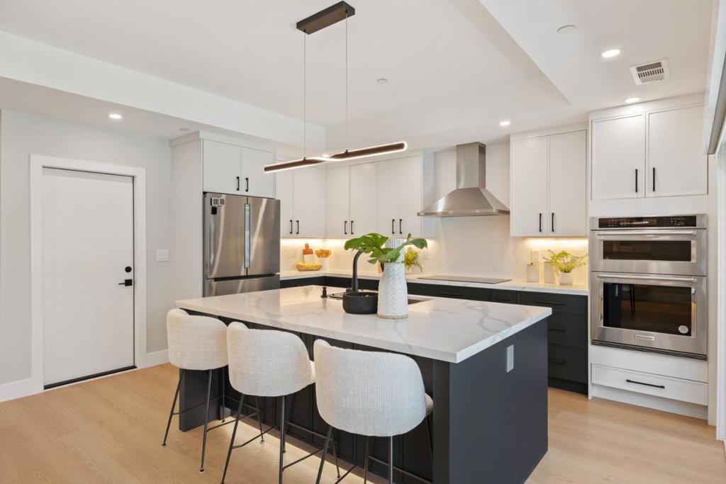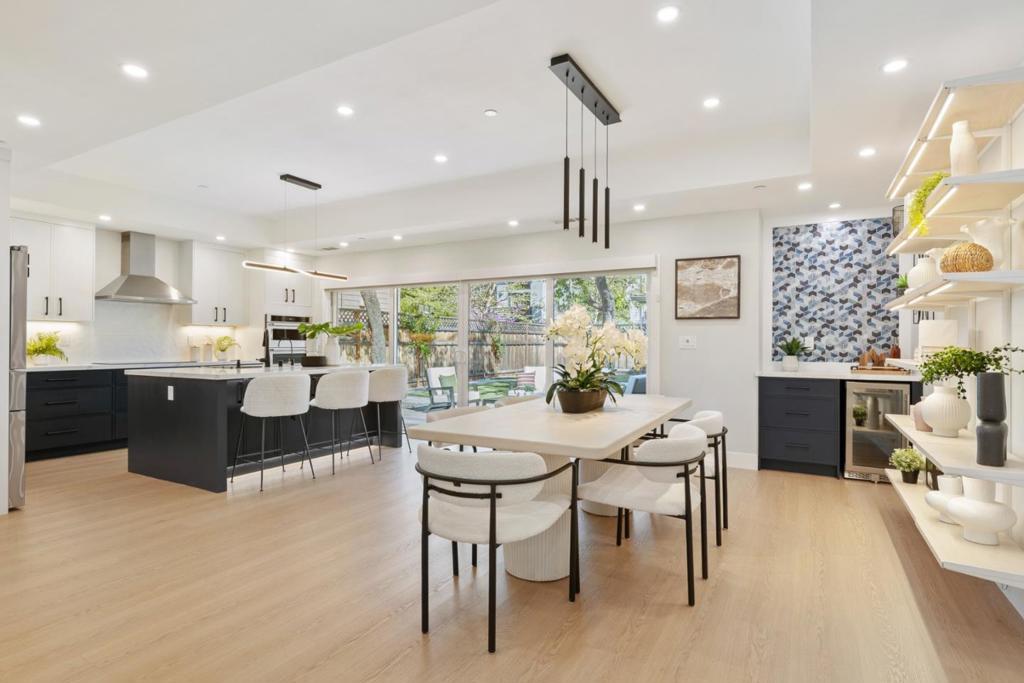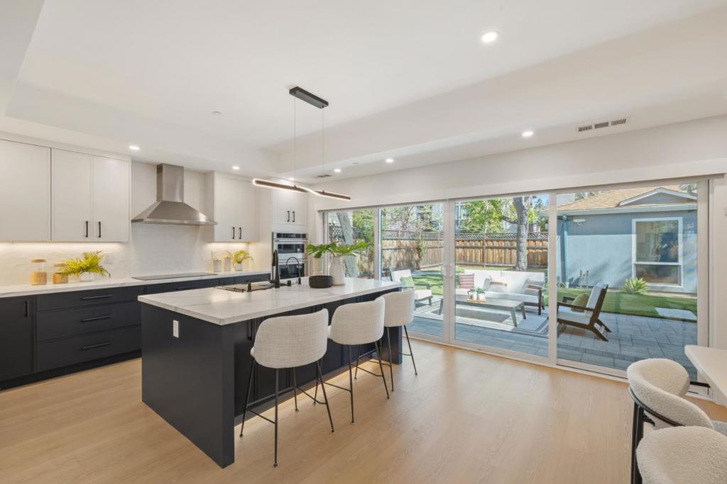 rebuilt from the foundation in 2024, this sleek contemporary home offers modern design and exceptional versatility with a fully independent detached ADU completed in 2022. Clean lines, a glass-panel garage door, and a striking blue entry set the tone for stylish interiors throughout. The main home features 3 bedrooms and 2 baths centered around an open-concept great room with a geometric tile fireplace, floating cabinetry, and seamless indoor-outdoor flow via sliding glass doors. The designer kitchen showcases navy and white cabinetry, marble-style quartz counters, stainless steel appliances, and a spacious island with seating. A formal dining area with open shelving and wine bar enhances functionality. The primary suite offers a custom walk-in closet and spa-like bath with freestanding tub, frameless shower, and dual vanities. Two additional bedrooms share a hall bath. An attached 1-car garage includes laundry. The detached 1-bedroom, 1-bath ADU (1948 Hackett Ave) features a full kitchen, living area, laundry, and mini-split HVAC ideal for guests or rental income. Low-maintenance synthetic lawns and landscape lighting complete the property. Ideally located one block from Rengstorff Park, near Castro Street and San Antonio Center, with access to top Mountain View schools.