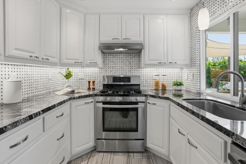 Exceptional curb appeal! Tastefully remodeled single-story home offering an ideal blend of style, function & indoor-outdoor living. Expansive TimberTech deck with Shade Sail, opens to the patio, thoughtfully curated lush landscaping where plants bloom year-round. Ideal for relaxing & effortless entertaining. Magical dining al fresco beneath the stars & cafe lights. Completely reimagined kitchen is a standout, featuring stainless appliances, granite counters, basketweave tile backsplash, extensive cabinetry w/pull-out shelving & dual pantry. Open-concept great room connects the kitchen/dining & family area under a vaulted ceiling, anchored by a resurfaced wood-burning fireplace w/custom mantle, firebox screen & granite hearth. Abundant natural light fills the home through dual-pane windows & sliding doors, complemented by louvered shutters, layered lighting throughout. The well-designed floor plan provides comfortable separation of spaces, including a step-down living room for added character. A spacious primary suite offers direct backyard access, dual closets, an updated en-suite bath w/mosaic tile accents & granite vanity. Additional highlights include attractive LPV bamboo & tile floors, a Murphy bed, HVAC/ceiling fans, newer composition roof, copper plumbing plus much more!