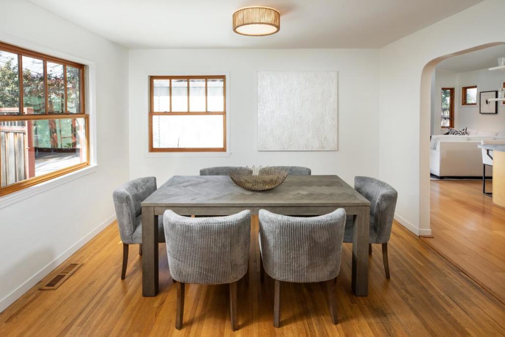 Classic mid-century character and a thoughtful expansion come together in this beautifully updated solar-powered home in Allied Arts. Original details, including clinker brick accents and a signature hexagonal window, reflect the homes architectural heritage, while the significant expansion introduces modern livability with an open great room the centerpiece of the home with kitchen and family room together beneath a dramatic vaulted ceiling. Clerestory windows and custom-paned French doors with full-width sidelights on two sides fill the space with natural light and open the interiors to enchanting patios for outdoor living. Bamboo floors and sleek maple cabinetry add a modern counterpoint to the homes classic design, which includes adjoining formal living and dining rooms. Three bedrooms are arranged on one convenient level, including a primary suite with adjoining office and outside entrance. Wraparound outdoor spaces on three sides of the corner lot create multiple options for dining, lounging, entertaining, and relaxing in a large spa beneath mature trees in remarkable privacy from the street. All of this is just blocks from parks, a bike and pedestrian bridge to Stanford Shopping Center, and excellent Menlo Park schools. Welcome Home!
